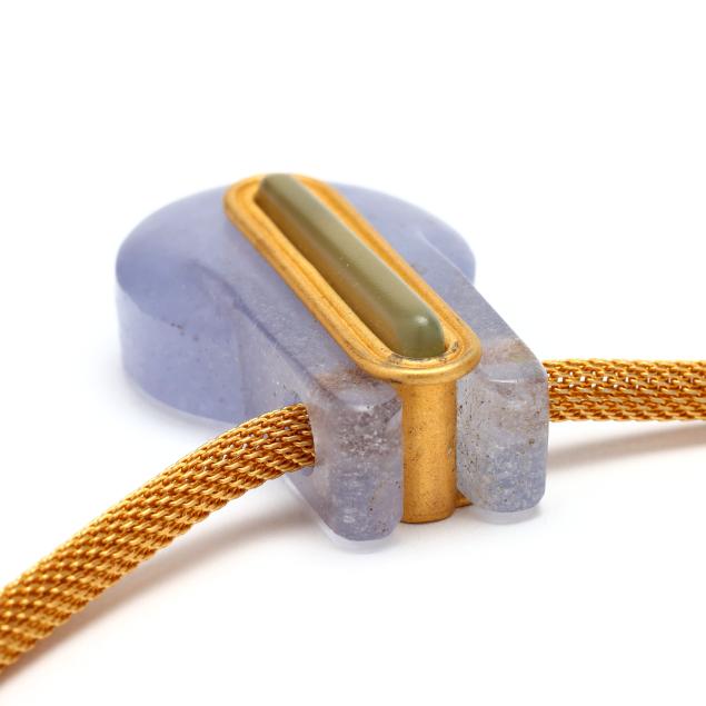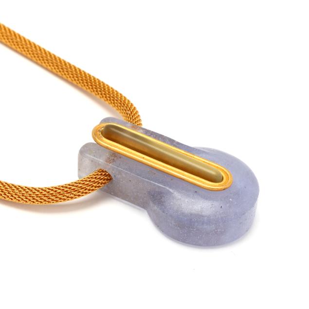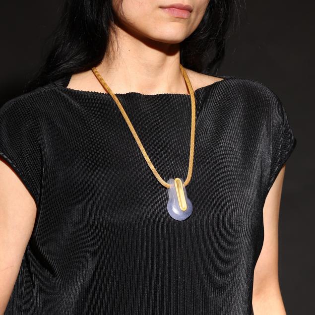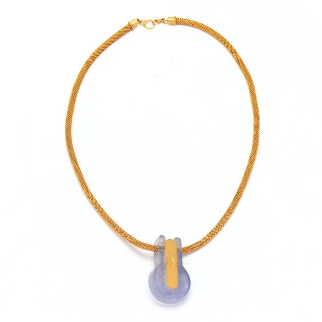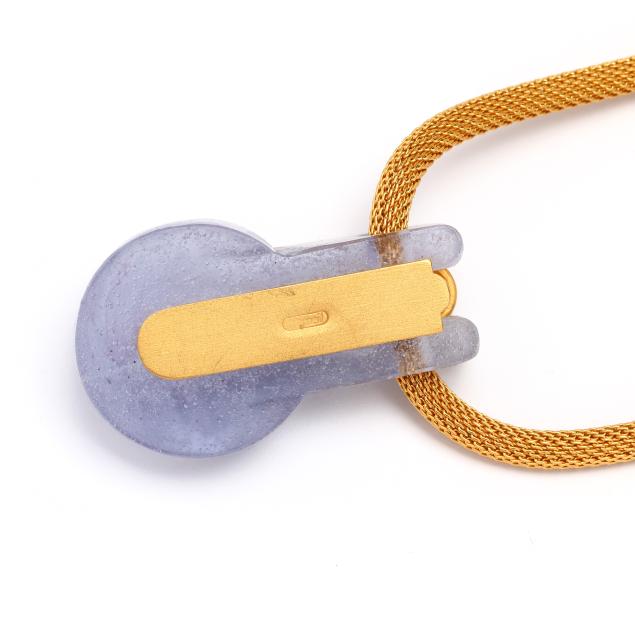 Circa 1997, the pâte de verre glass pendant with gilt brass and glass inlay, suspended from a gilt brass woven mesh necklace, completed with a lobster clasp, signed.