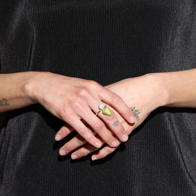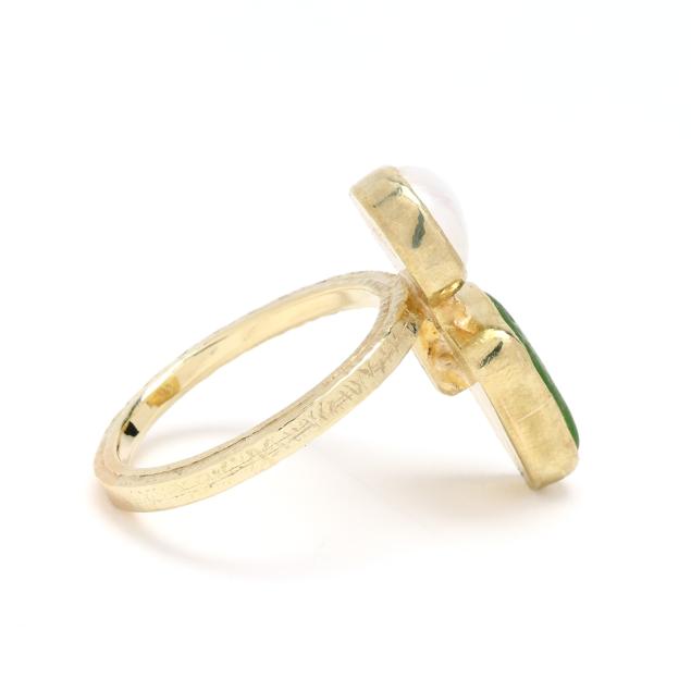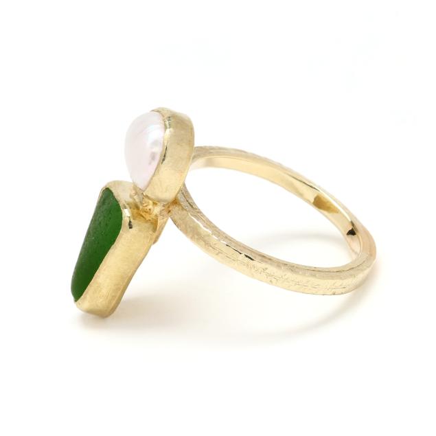 The ring bezel set with a white semi-baroque pearl and green sea glass, completed with a hammered finish shank, signed and marked 18K.