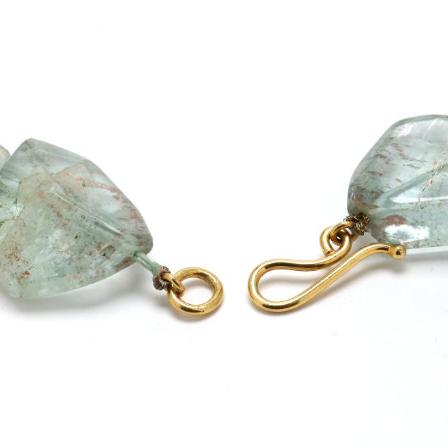 Strung knotted with tumbled rough beryl and a round Tahitian pearl (13.3mm), completed with a gold hook clasp, testing 18KT, appears unsigned.