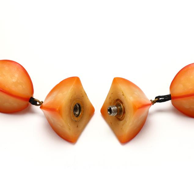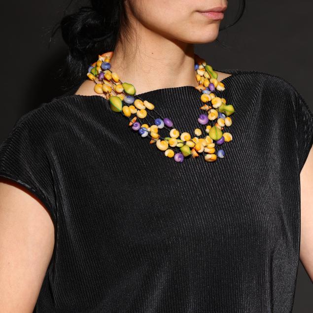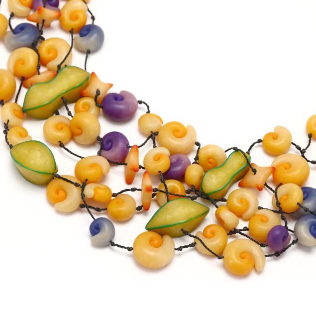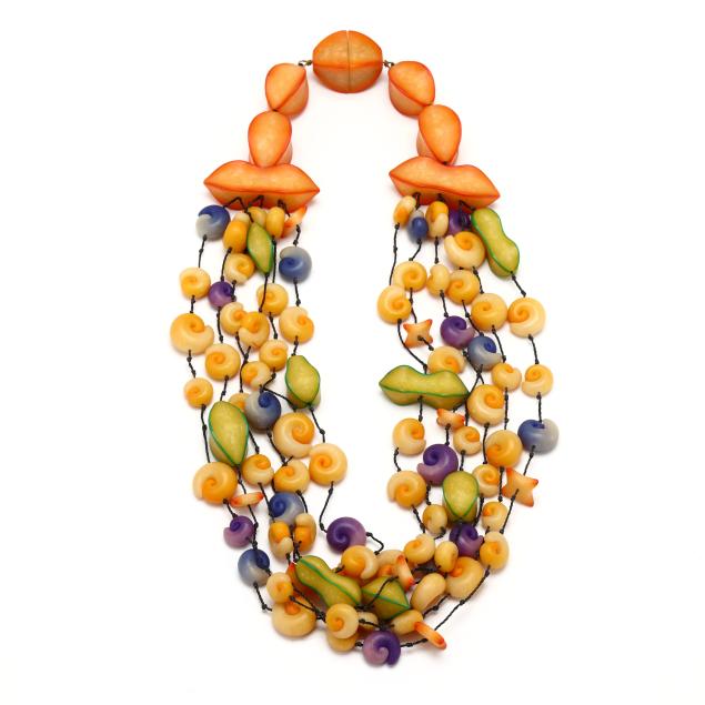 The multi strand necklace strung knotted with naturalistic motif polymer clay beads and completed with a twist clasp, appears unsigned.