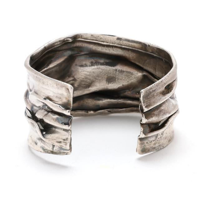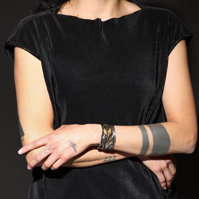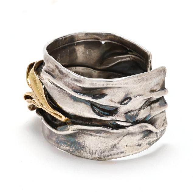 The silver cuff bracelet in naturalistic motif with gold calla lily flower, testing silver and 14KT gold, appears unsigned.