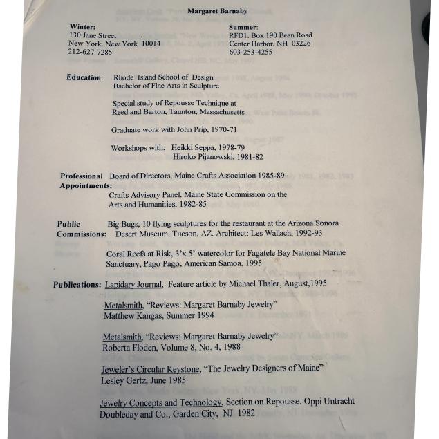 Accompanied by a copy of Margaret Barnaby's curriculum vitae.