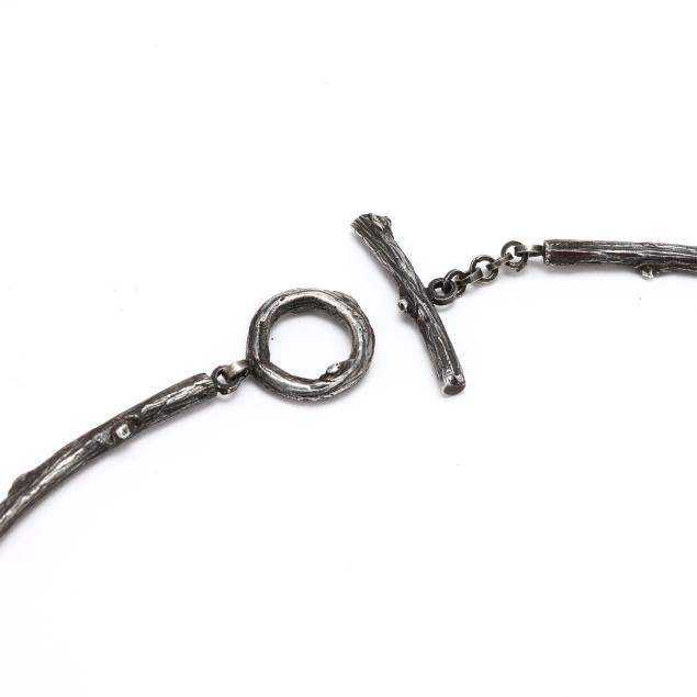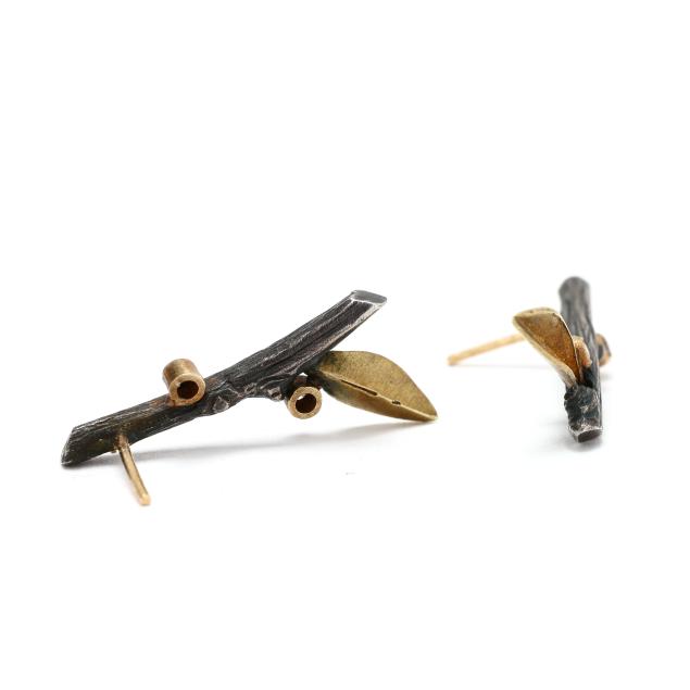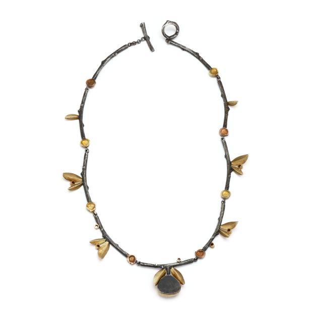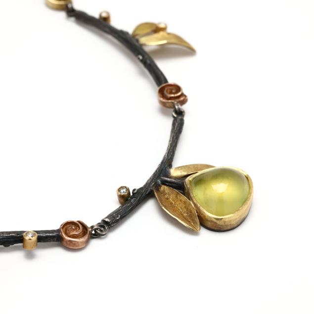 Each link in oxidized silver faux bois motif with gold leaf and berry elements interspersed with bezel set full cut round diamonds, the center link set with a cabochon cut prehnite, completed with a toggle clasp, and with a pair of earrings en suite, completed with posts, XRF testing sterling silver, 18KT gold, and 14KT pink gold.