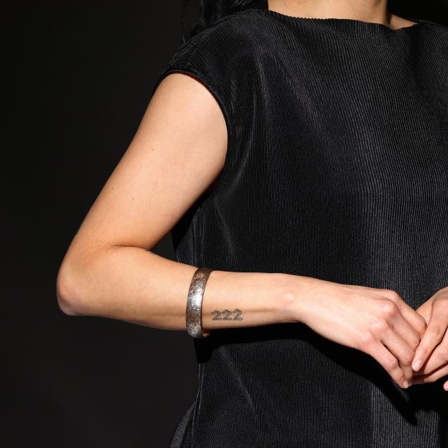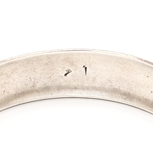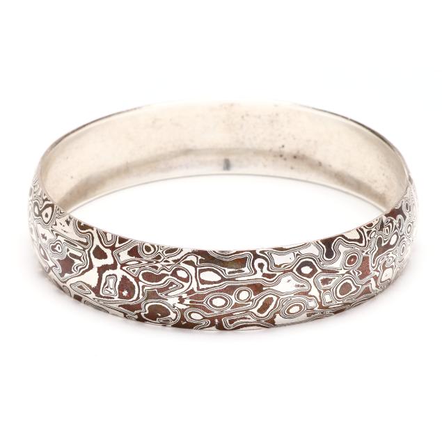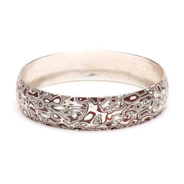 The domed solid bangle with mokume gane design, with markings.
