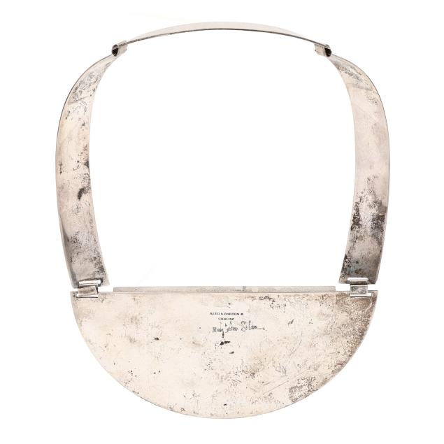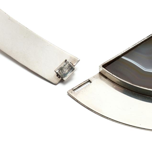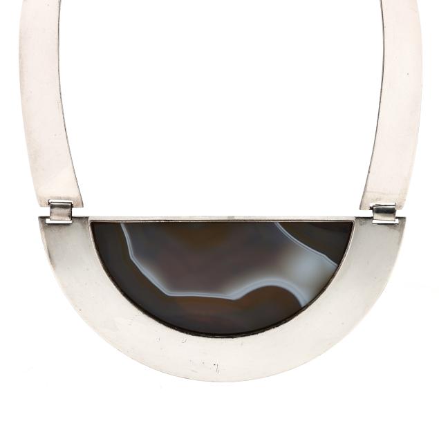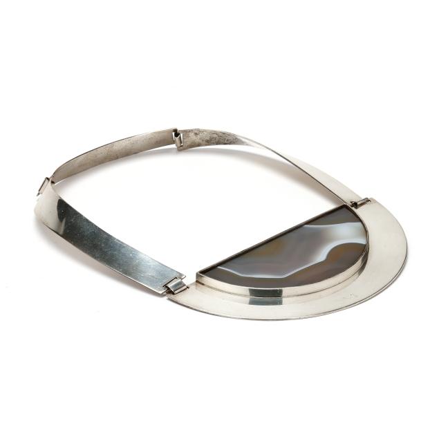 Silver collar necklace with inset demilune agate, hinged design, with hook and eye closure, stamped Reed & Barton Sterling and signed.