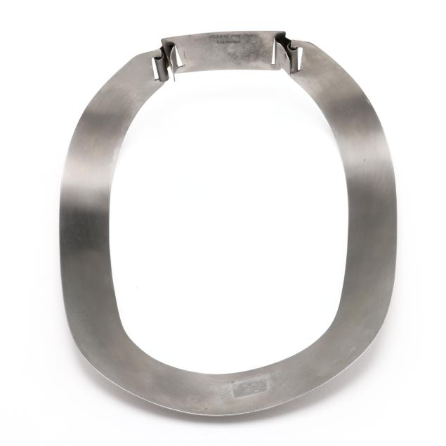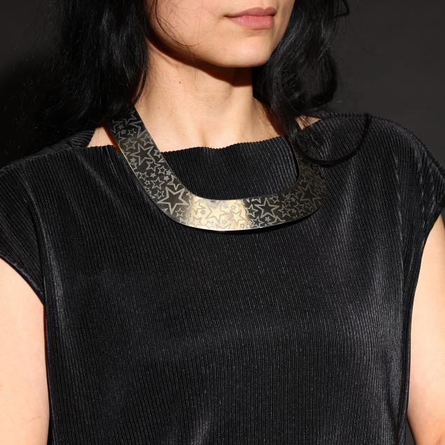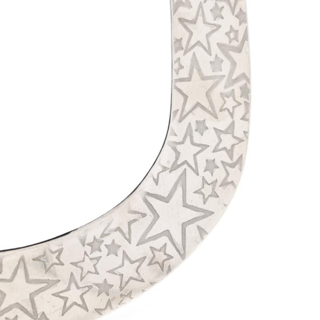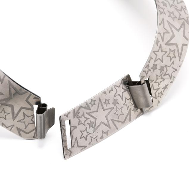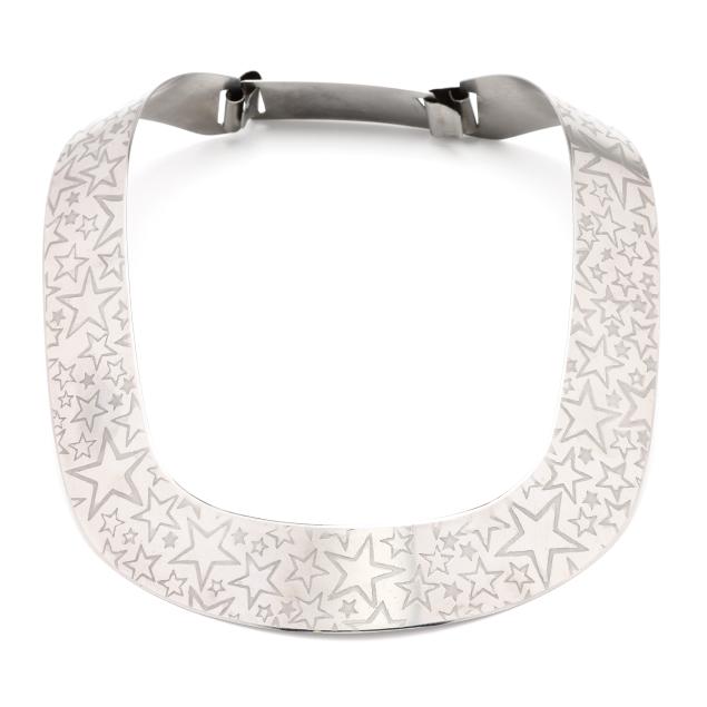 Circa 1960s, U-form necklace with stamped star motif in various sizes, the necklace in a convex design to fit against the body, completed with a hook clasp, etch signed Stainless / Mary Ann Scherr.