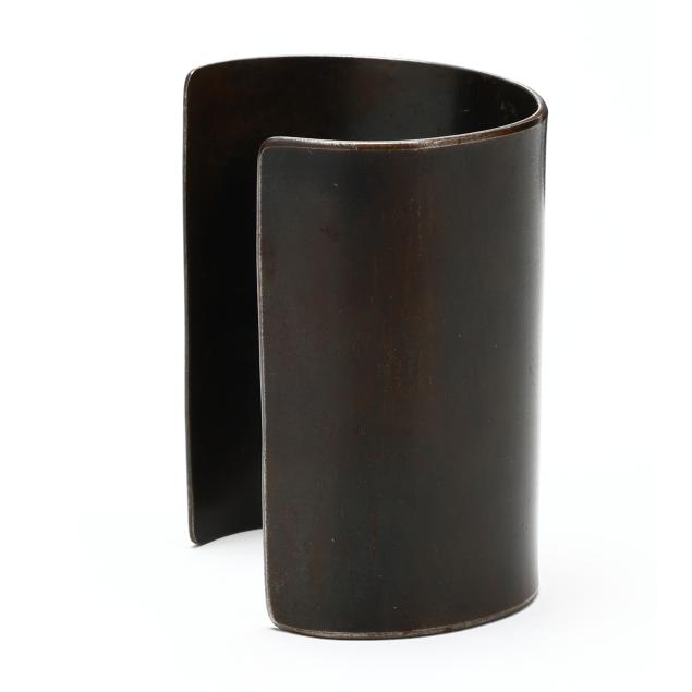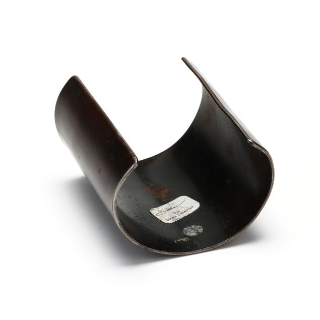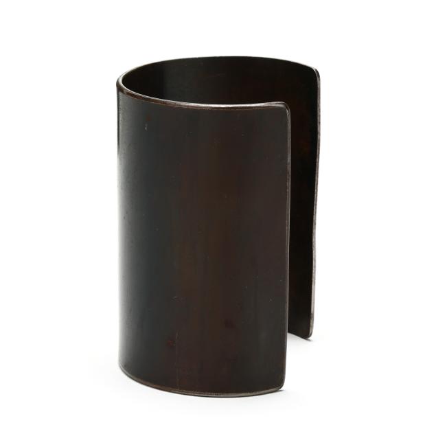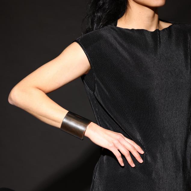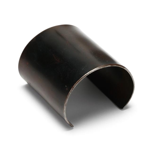 The elongated cuff bracelet in oxidized stainless steel, retains label with signature and reading The Scherr Collection.