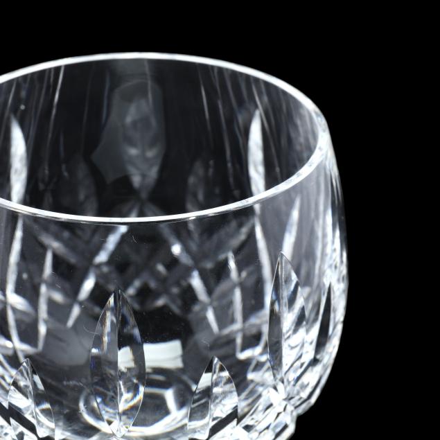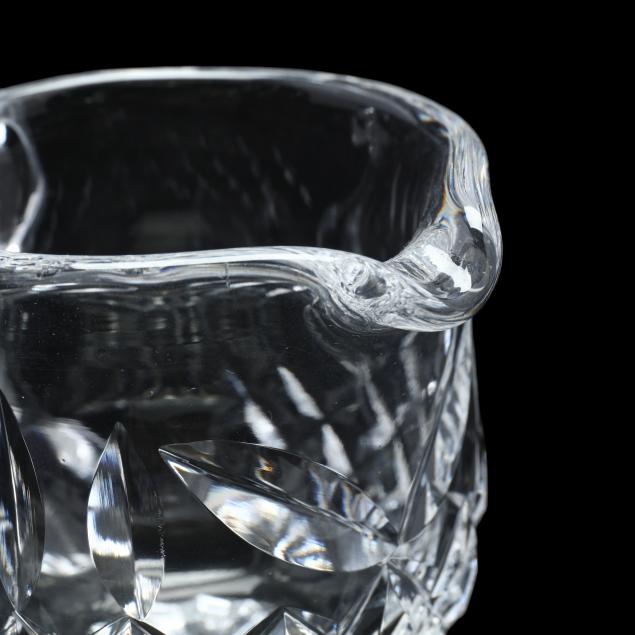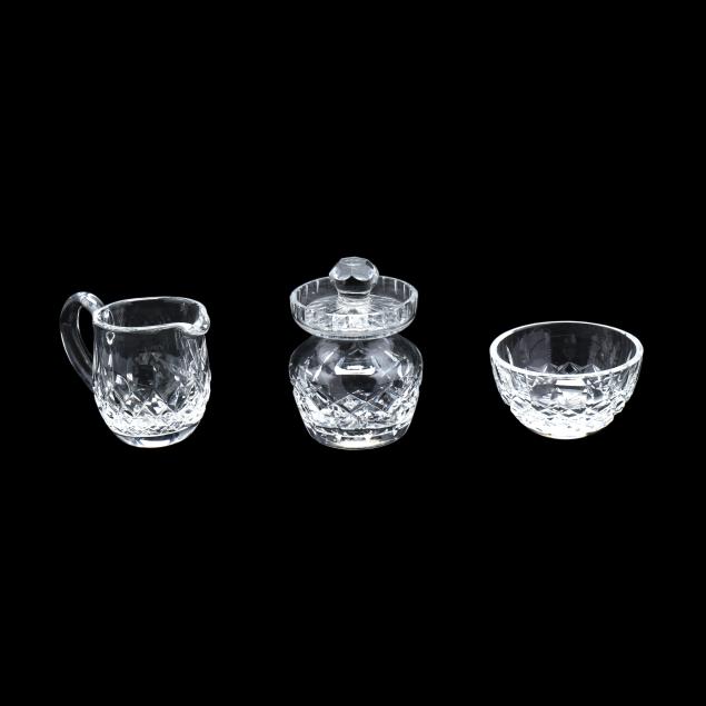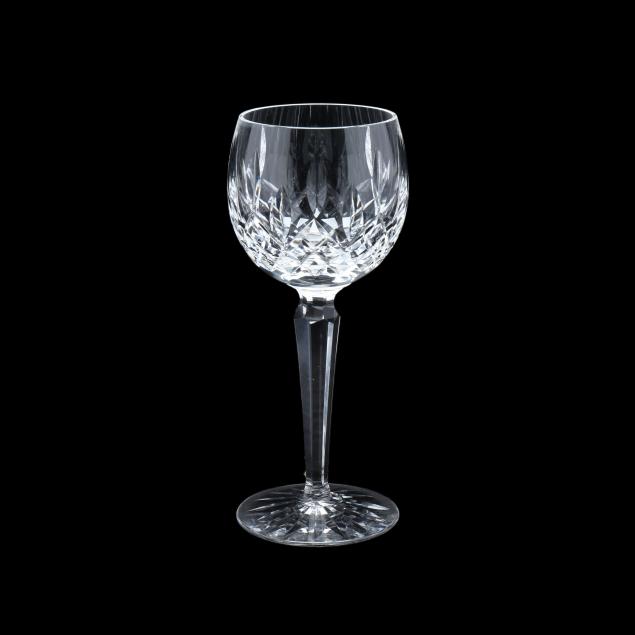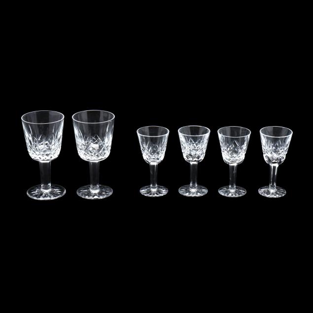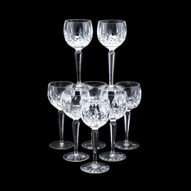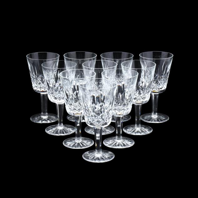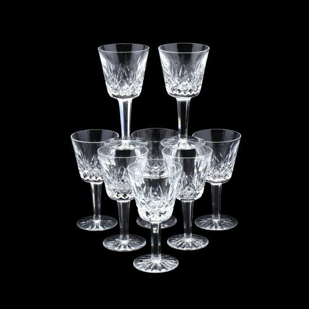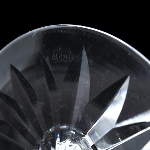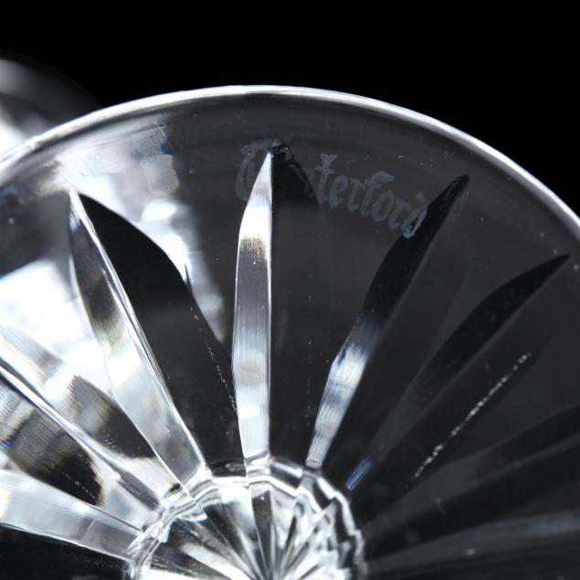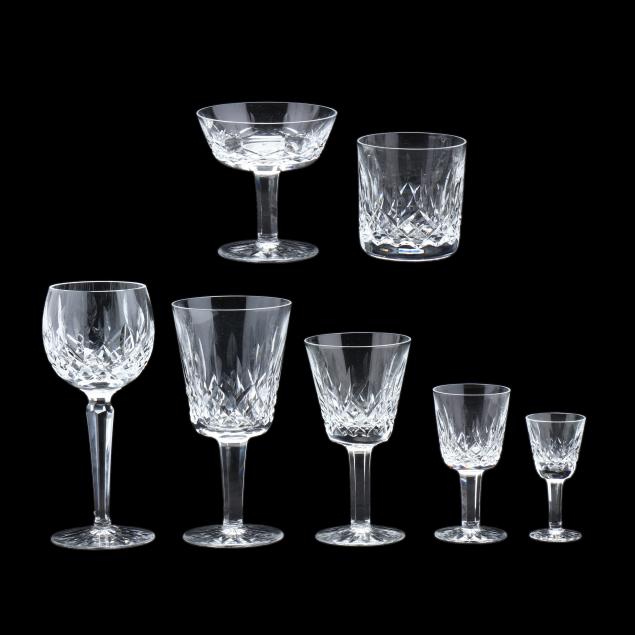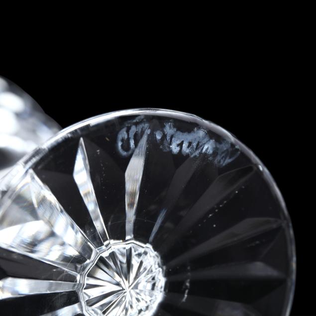 Ireland, late 20th century, including (8) wine hocks (7.5 in.); (10) water goblets (7 in.); (8) wine goblets (6 in.); (8) champagne coupes (4.25 in.); (8) whiskey glasses (3.25 in.); (2) dessert wines (4.25 in.); (4) cordials (3.5 in.); (1) creamer; (1) sugar bowl; and (1) lidded jam jar, signed.