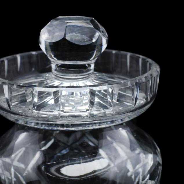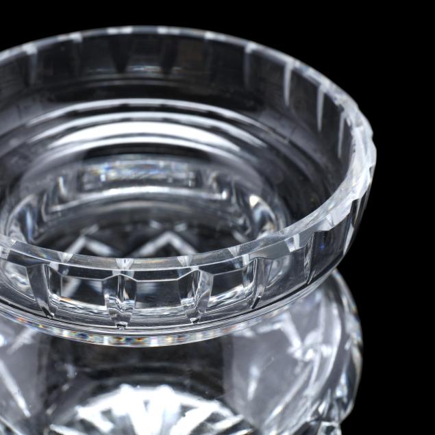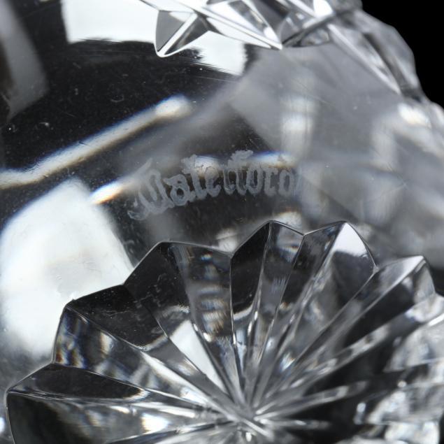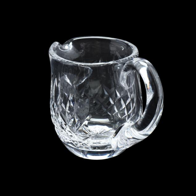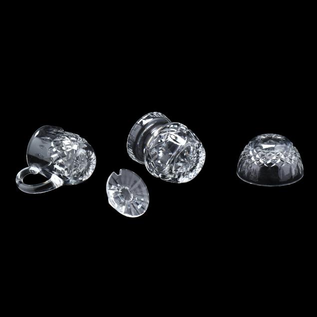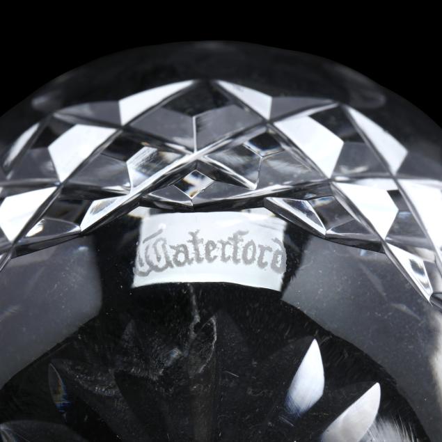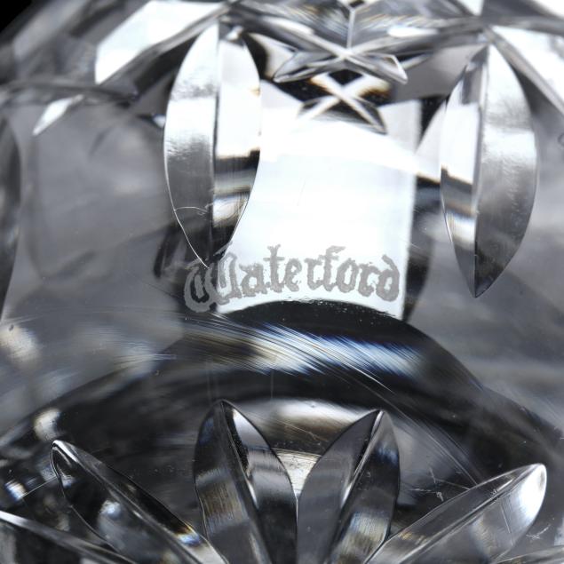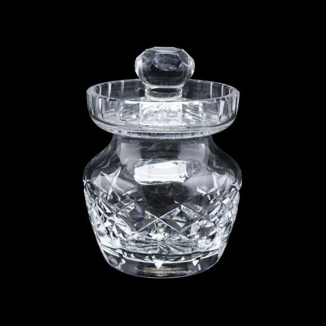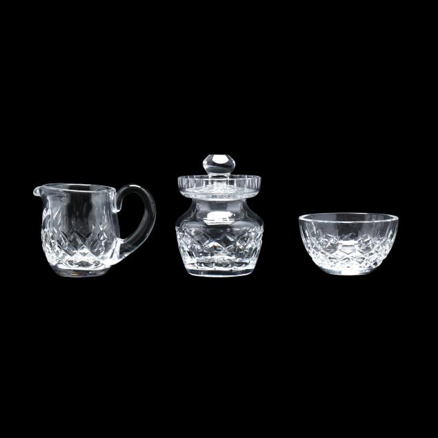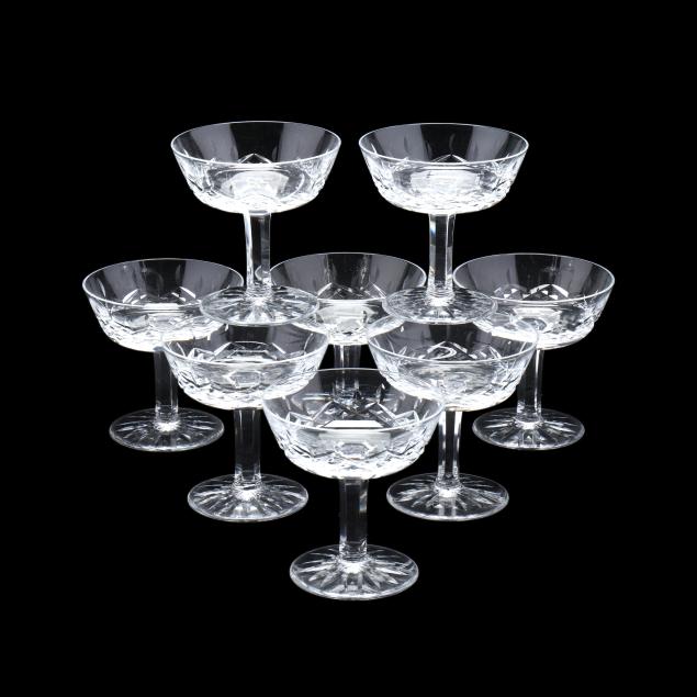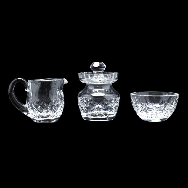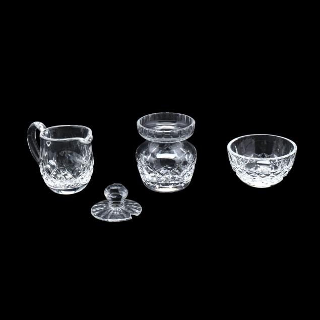 Ireland, late 20th century, including (8) wine hocks (7.5 in.); (10) water goblets (7 in.); (8) wine goblets (6 in.); (8) champagne coupes (4.25 in.); (8) whiskey glasses (3.25 in.); (2) dessert wines (4.25 in.); (4) cordials (3.5 in.); (1) creamer; (1) sugar bowl; and (1) lidded jam jar, signed.