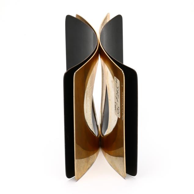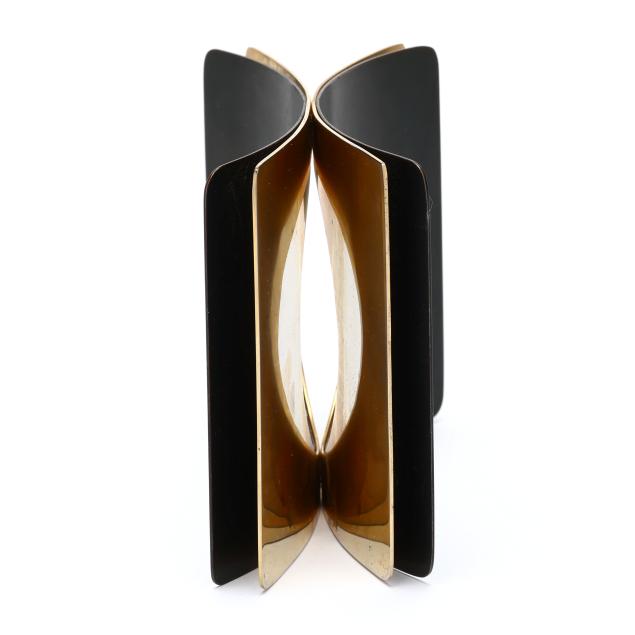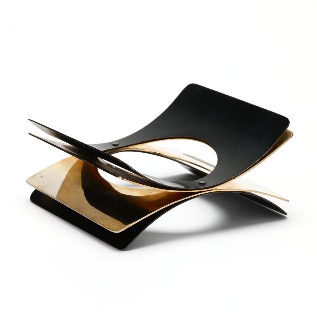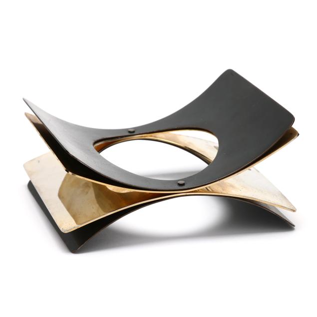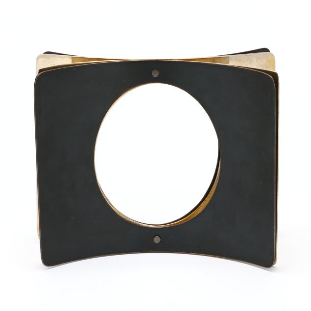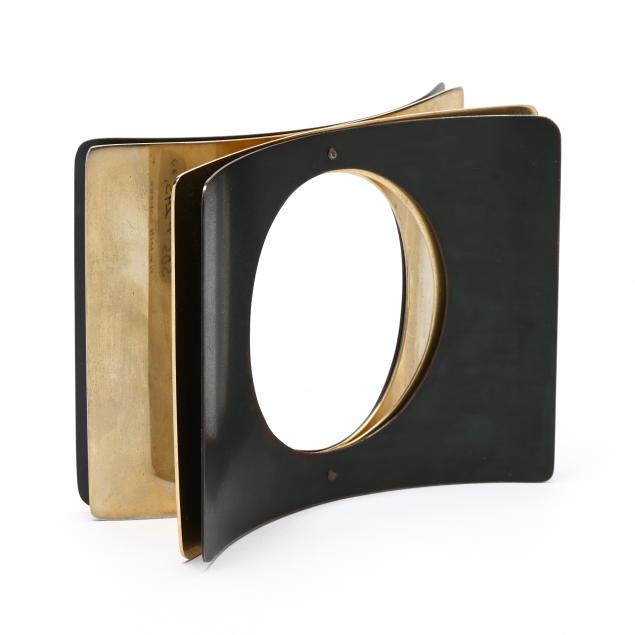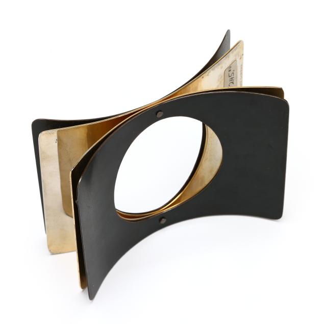 1979, the layered cuff bracelet with two interior brass layers and two exterior oxidized steel layers, riveted at middle, with oval opening, signed, stamped Sherr, and retains label.