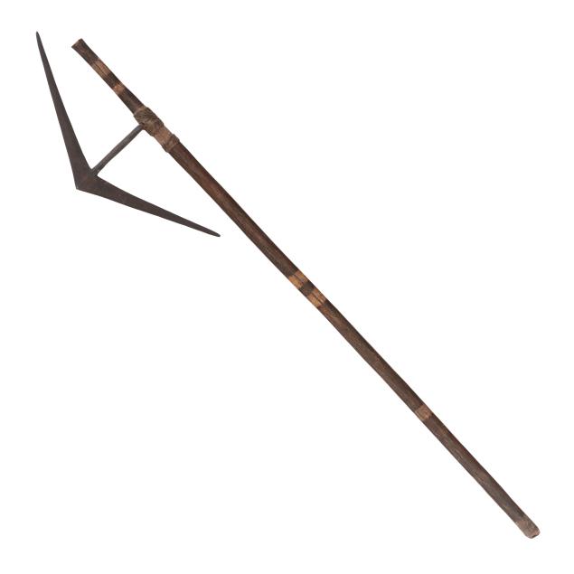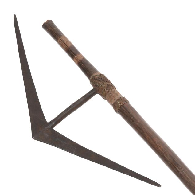 Some wear and rust spotting to metal; the axe with losses to decorative metal wrapping.