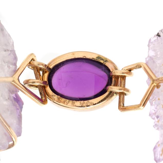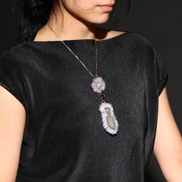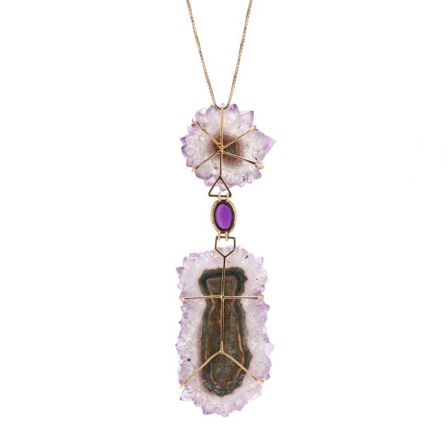 Long pendant with two freeform amethyst slices joined by a bezel set oval cabochon amethyst, suspended from a gold box link chain and completed with a gold-filled lobster clasp, signed, chain stamped 14K, clasp stamped GF, and with signature tag.