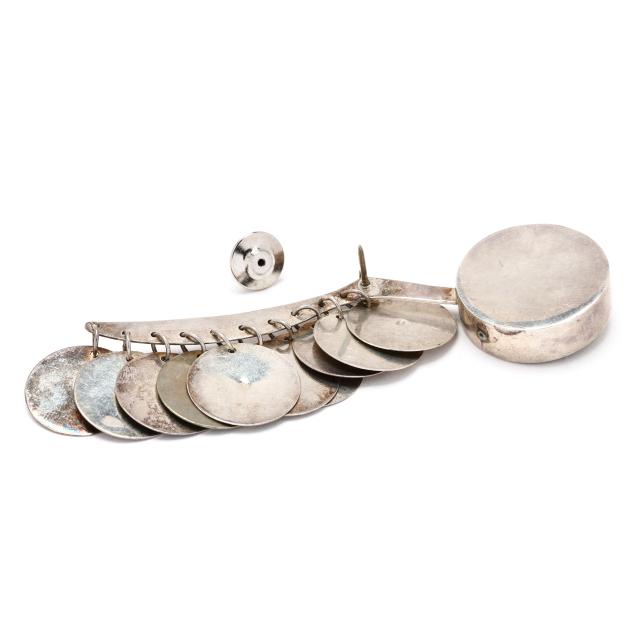 Circular inset medallion with the artist's signature reticulation work, shaped arm with circular silver dangles, completed with a pin back, appears unsigned.