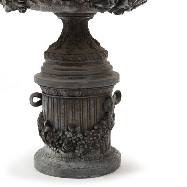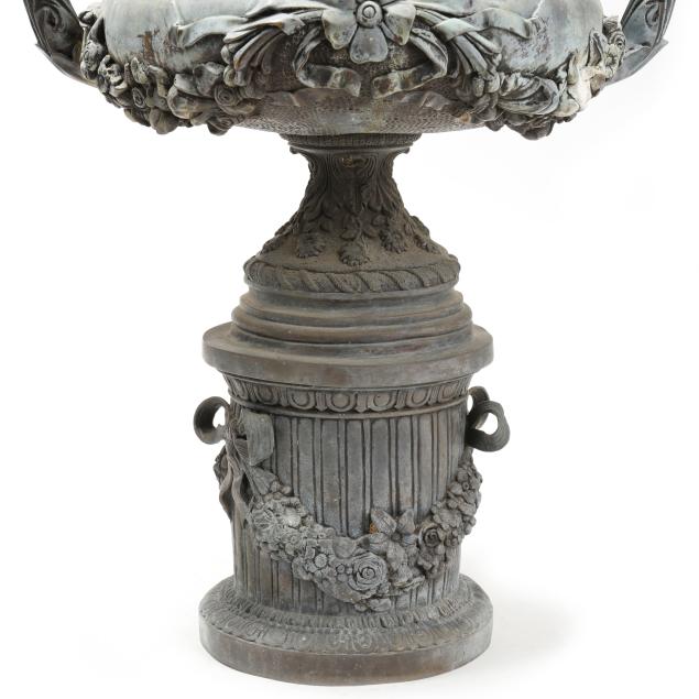 Late 20th century, cast as a bulbous urn on pedestal with foliate scroll double handles, raised on an integral columnar plinth with ribbon-tied floral garland, unmarked.