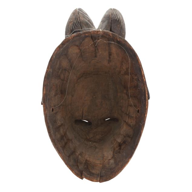 bata (ram) ceremonial mask with slitted eyes, heart-shaped face with mouth at the bottom, surrounded by ram-like horn frame (19 x 11 x 1/2 in.); and a Songye female