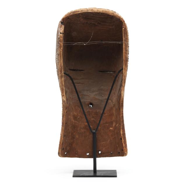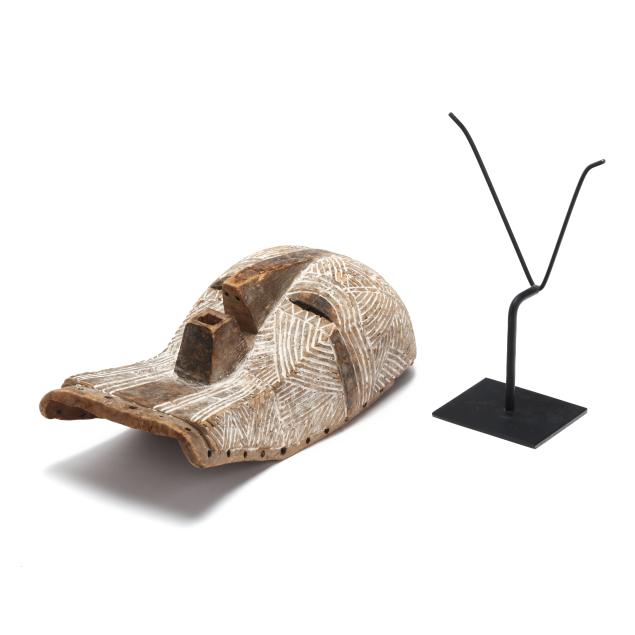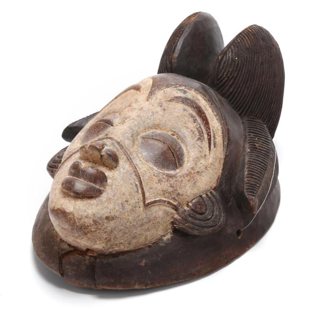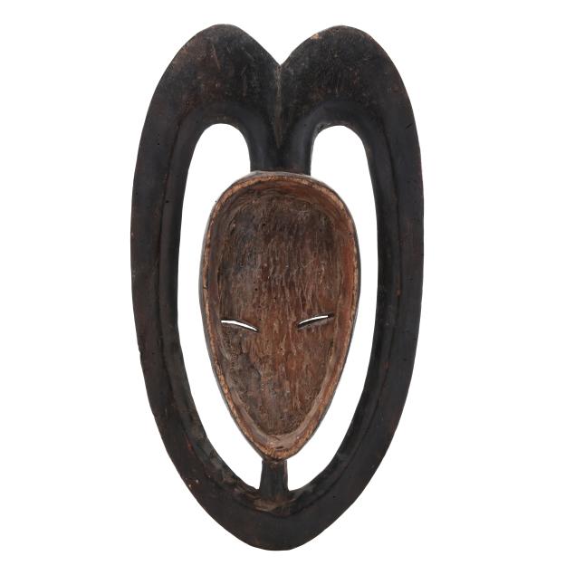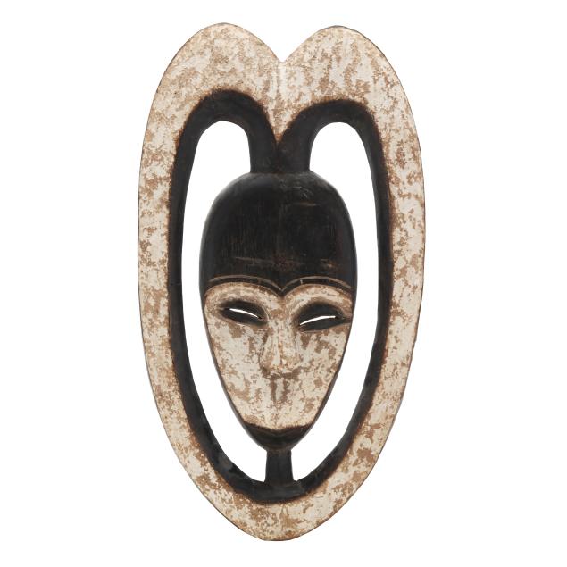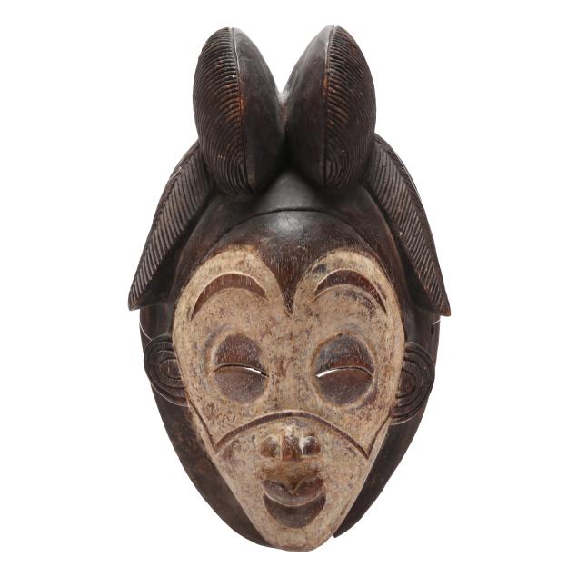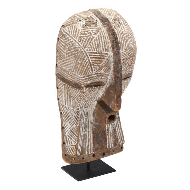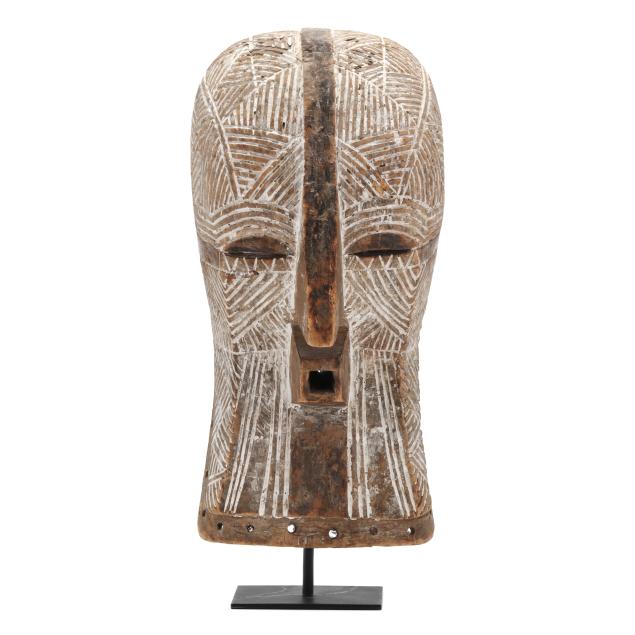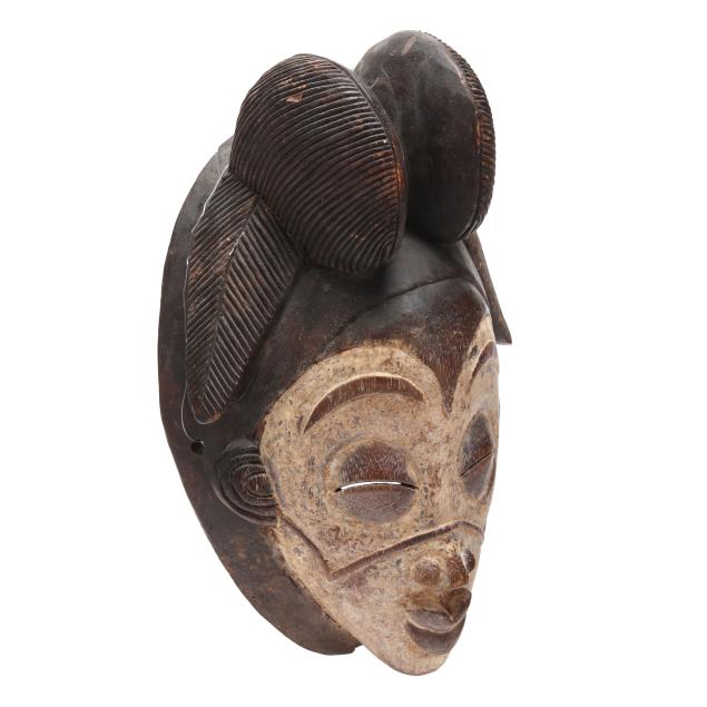 mukudj mask of a stylized and idealized woman with a tall coiffure, closed eyes and raised eyebrows (14 x 9 x 6 in.); and a Kwele