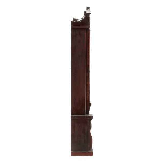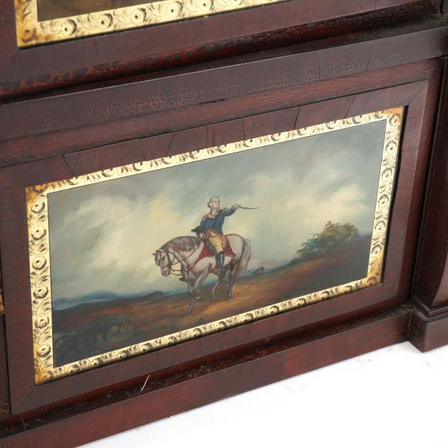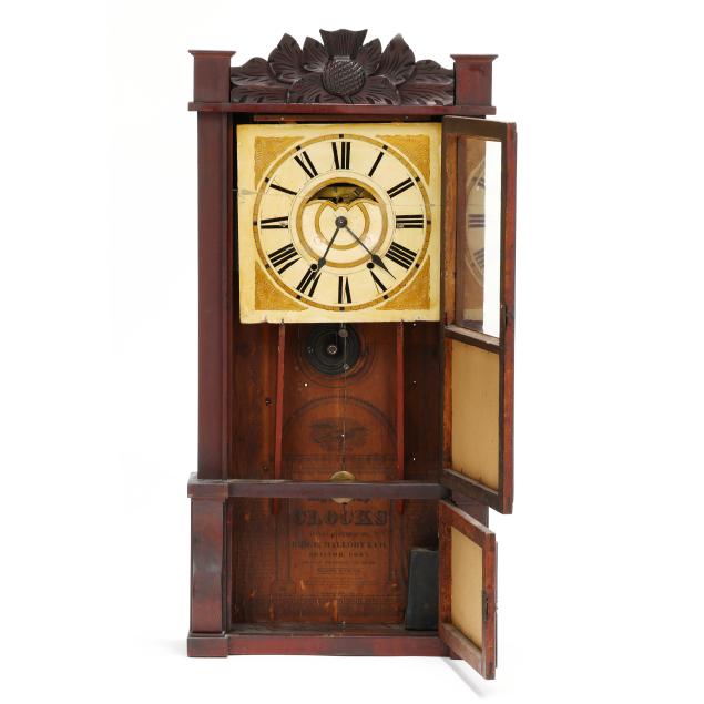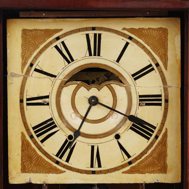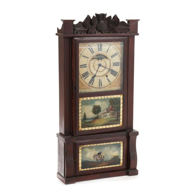 Bristol, Connecticut, second quarter 19th century, distinctive "triple decker" form, mahogany case with carved thistle pediment and lower scrolled stiles, retaining period lable to the interiorcase door with two eglomise panels relating to George Washington and patriotic theme, beneath a 11 1/2-inch painted and gilt square wood dial, operated by a dual-weight driven 8 day movement, with pendulum and keys.
