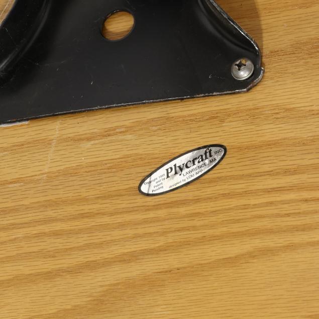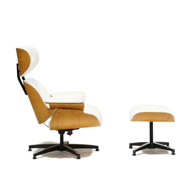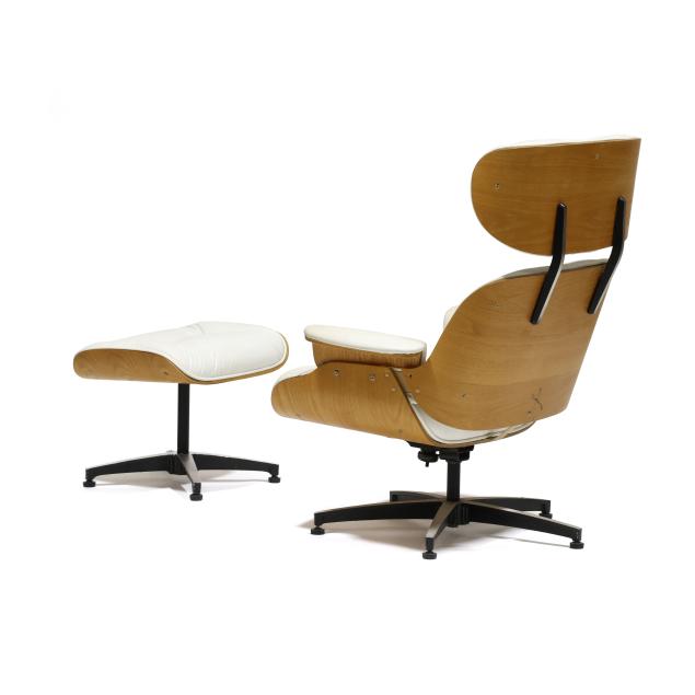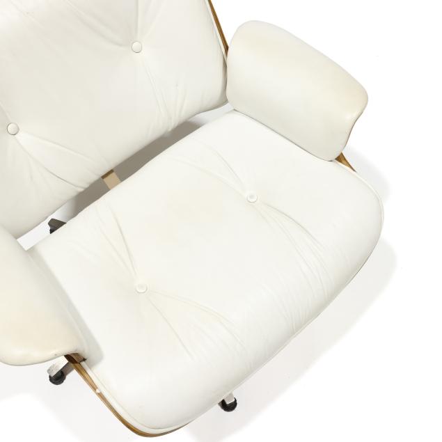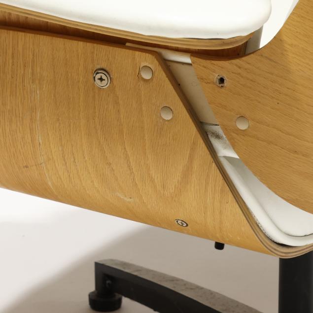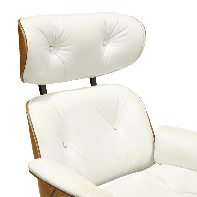 Plycraft, circa 1980, oak bentwood frame, white vinyl upholstery, swivel chair with spring reclining action (39.5 x 33 x 27 in.); together with a swivel rectangular cushioned ottoman (18 x 20 x 16 in.), labeled.