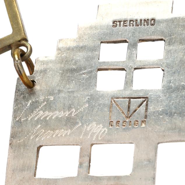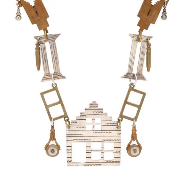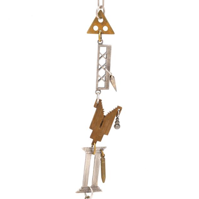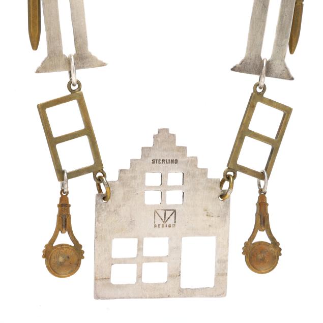 Circa 1990, the silver necklace including geometric, column, and house links, suspending multiple dangles, completed with a toggle clasp, house and column form links stamped Sterling, signed and dated.