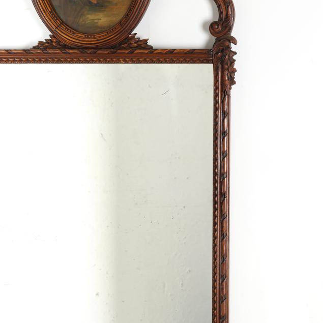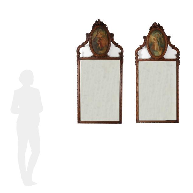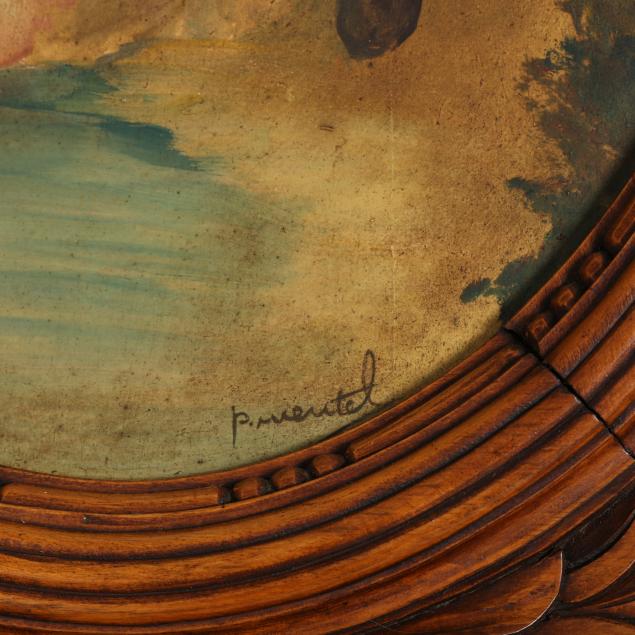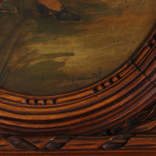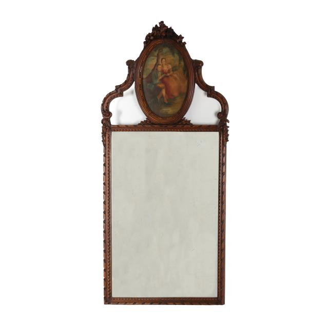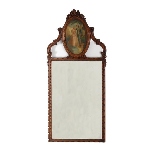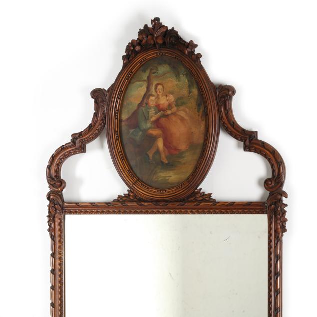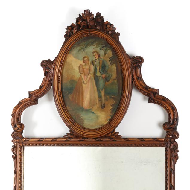 Mid-20th century, carved walnut frames, rectangular mirror surmounted by an oval panel with painted courting figures signed lower right "P. Mentel."