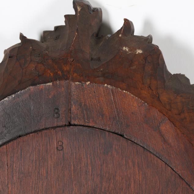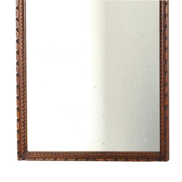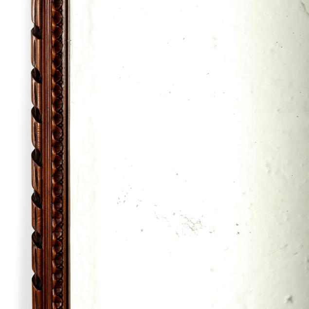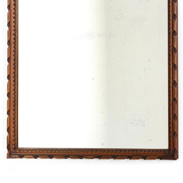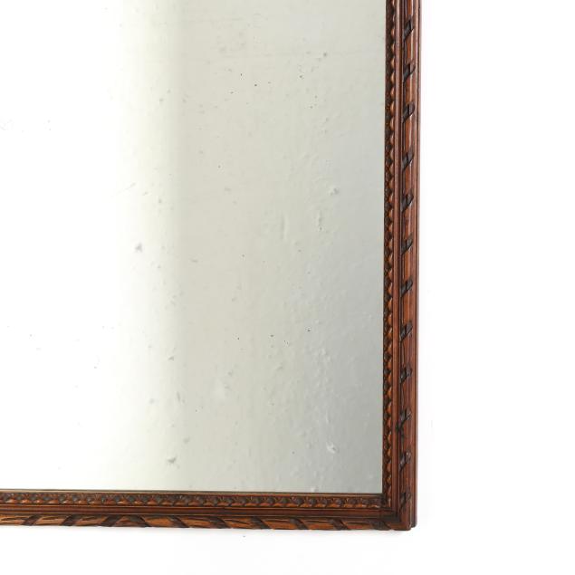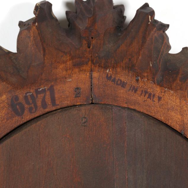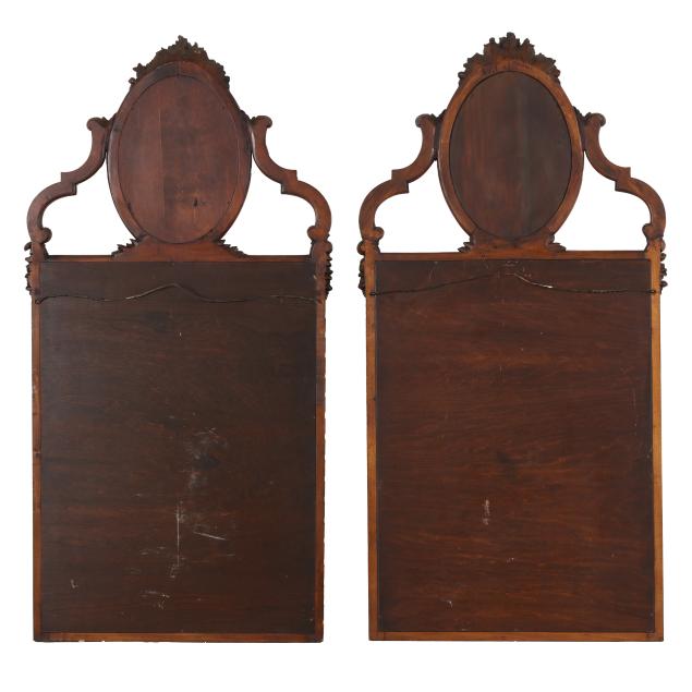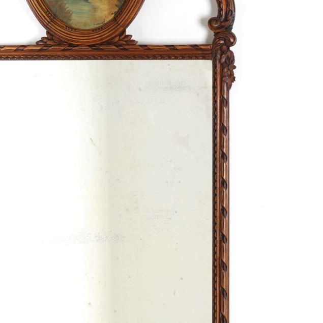 Mid-20th century, carved walnut frames, rectangular mirror surmounted by an oval panel with painted courting figures signed lower right "P. Mentel."
