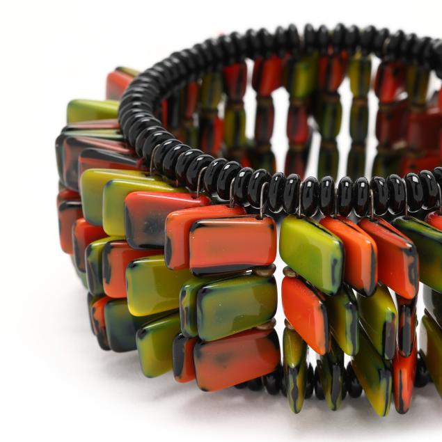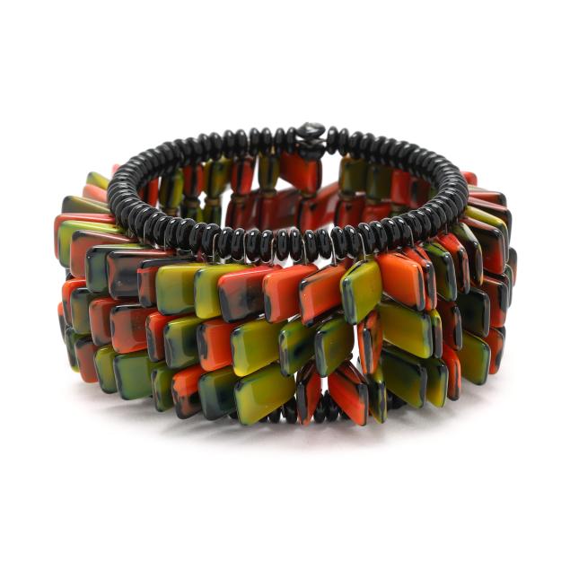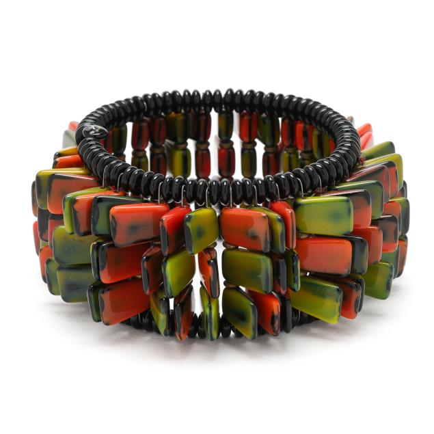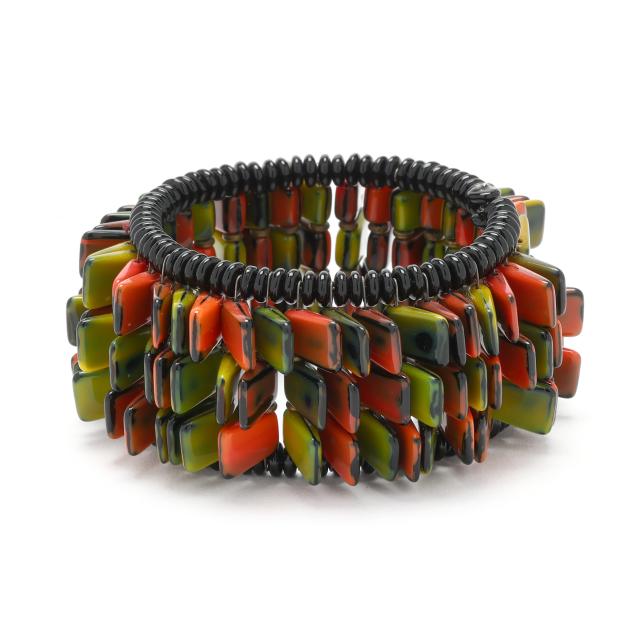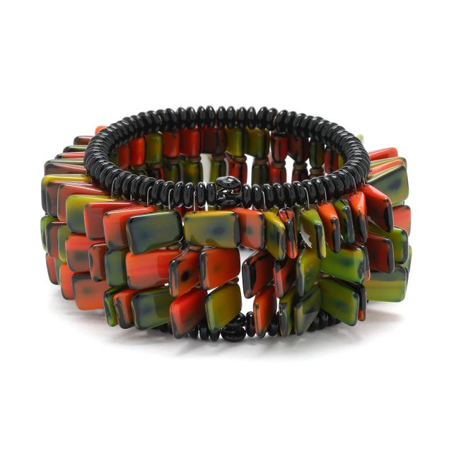 The three row bangle bracelet with multicolored tiles and black crystal bead edge.