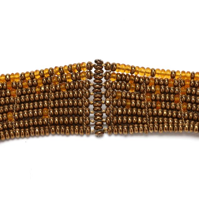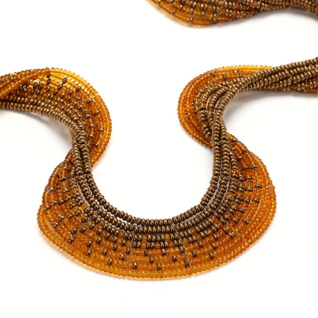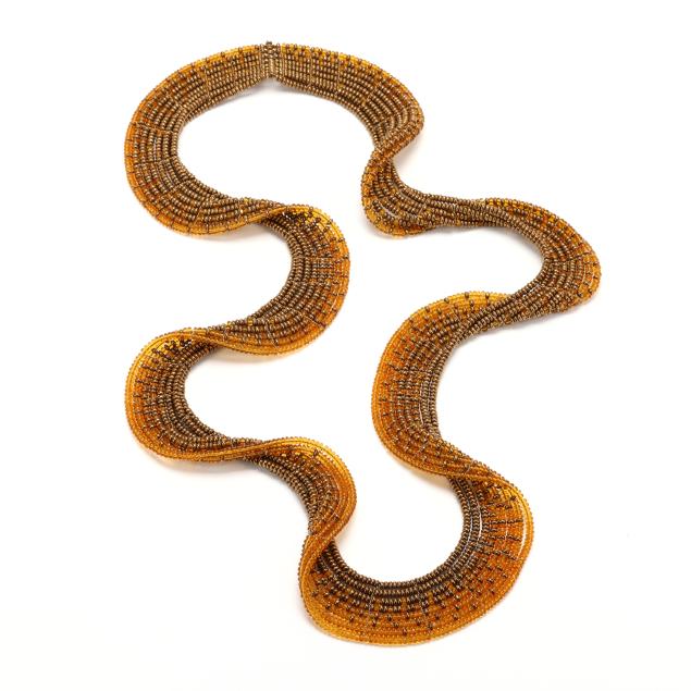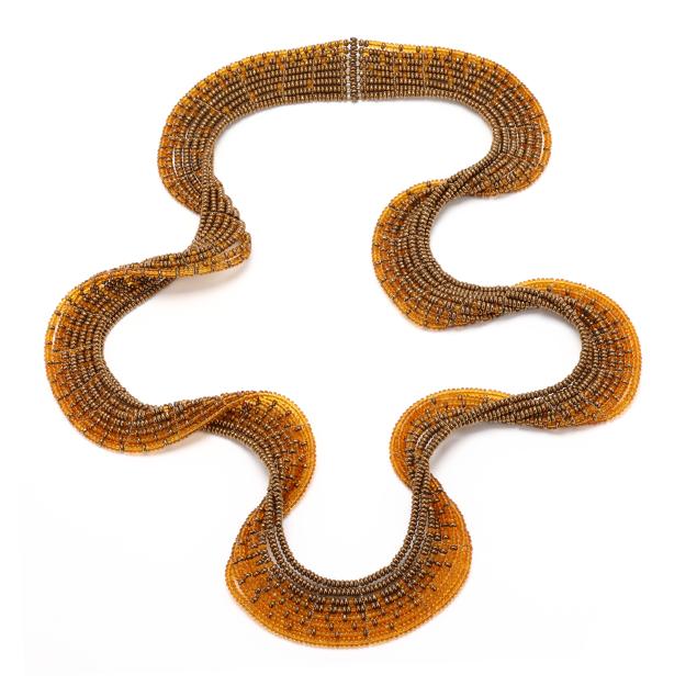 The necklace in spiral form with gold-tone and orange crystal beads, appears unsigned.