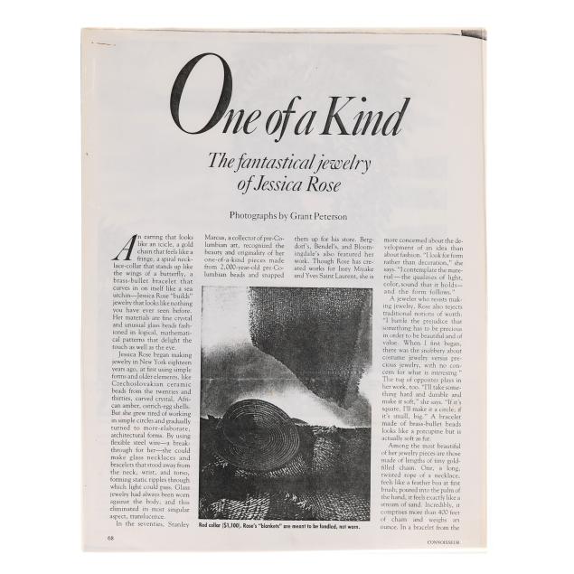 Jessica moved to New York in 1970. She met and married Aaron Rose and the two eventually settled in SoHo. While working as an assistant buyer at Bergdorf Goodman, she was inspired to create art jewelry from the old discarded decorative buttons found in a storage area. Her work was influenced by her extensive travels and the materials she found. She found immediate success and stores like Bergdorf Goodman, Henri Bendel, Brown's, Bloomingdale's and Neiman Marcus sold her pieces in their showrooms. Robert Lee Morris, proprietor of Artwear on New York's Upper East Side, championed her creations.