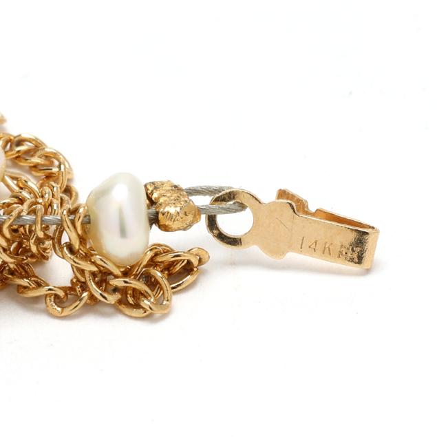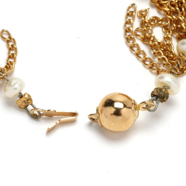 Fringe collar necklace with chains and pearls of varying shapes, completed with a ball clasp stamped 14K, chains XRF testing gilt brass.