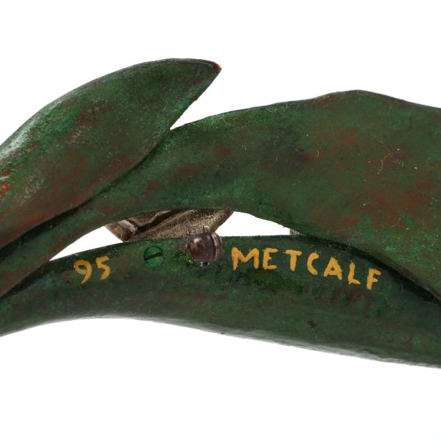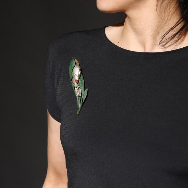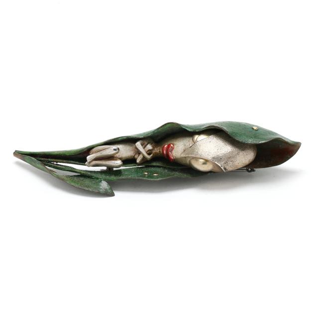 Circa 1995, the green painted brass leaf cradling a silver figure, completed with locking pin stem, signed and dated.