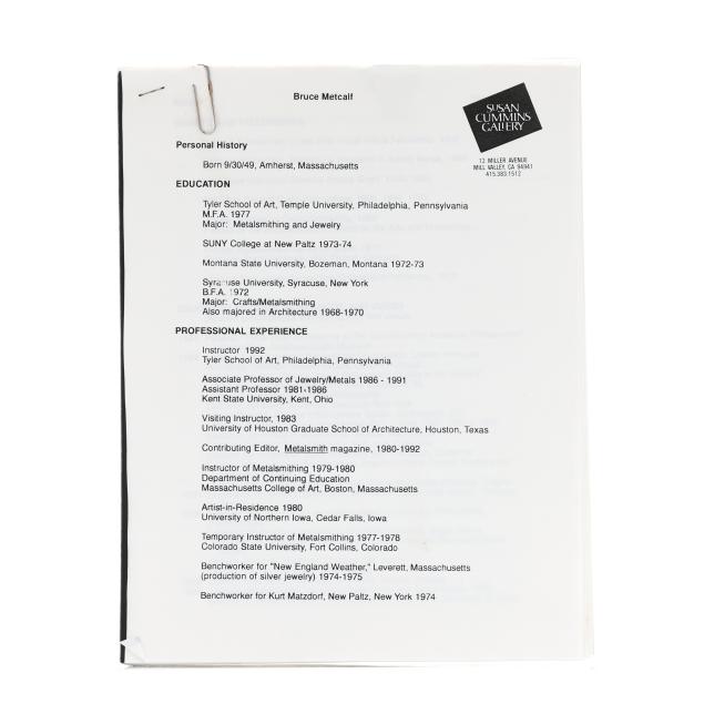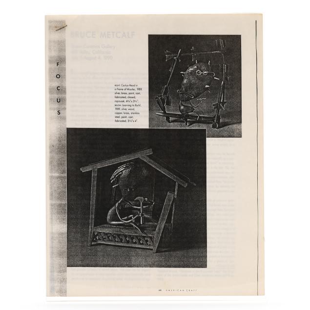 Accompanied by copy of article from American Craft dated October/November 1990, a copy of article from Metalsmith dated Winter 1990, and a copy of Bruce Metcalf's Curriculum Vitae from Susan Cummins Gallery.