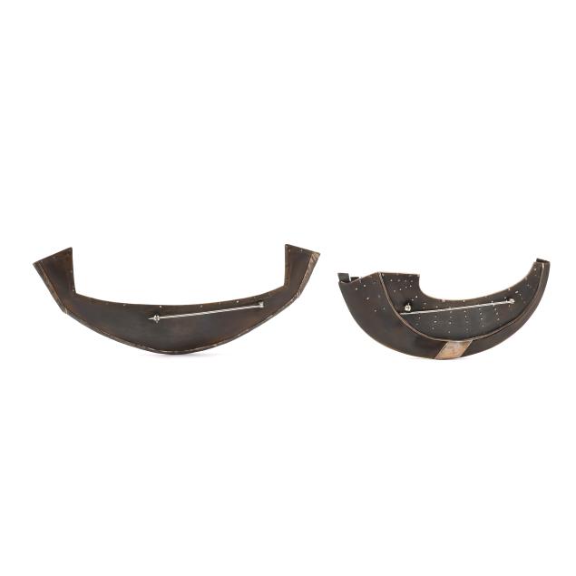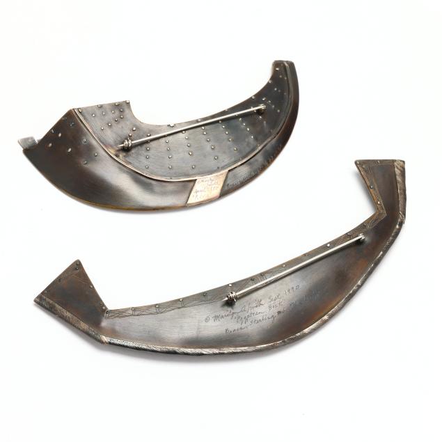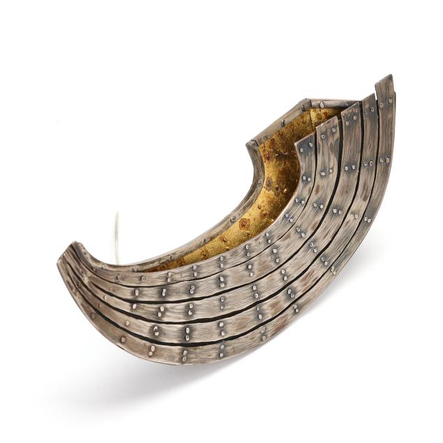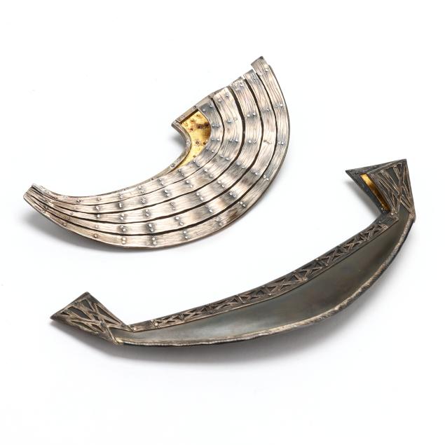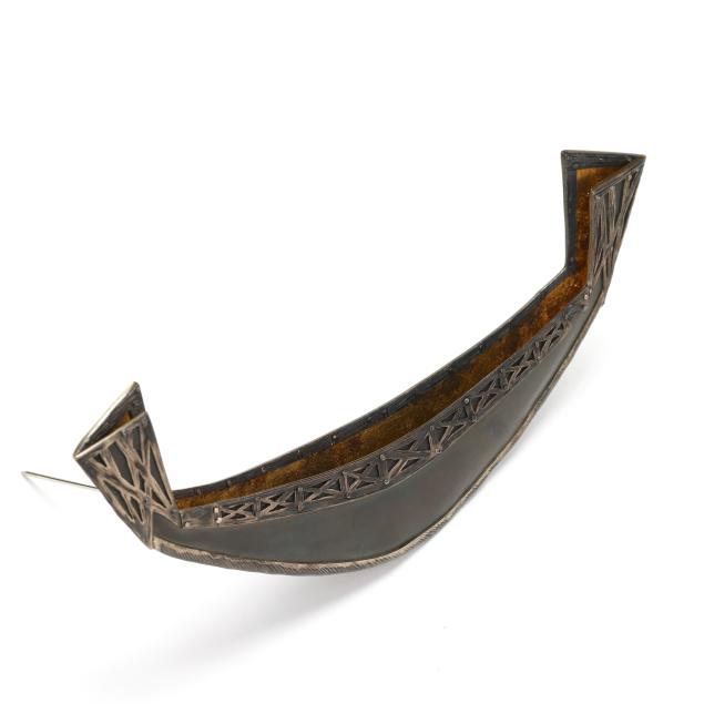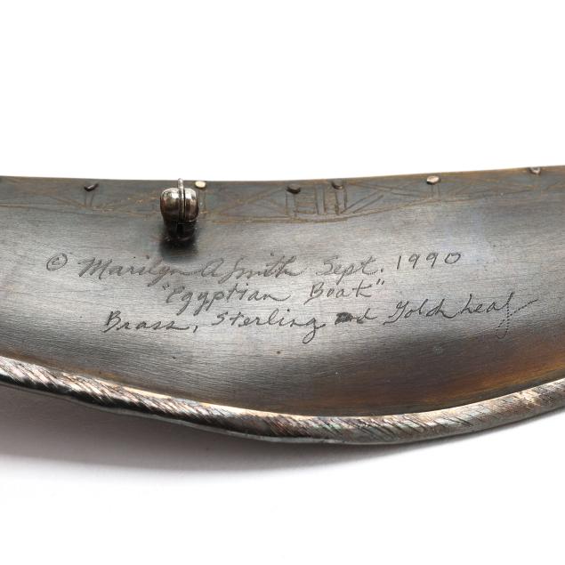 Egyptian Boat, a three dimensional representation of a boat in brass and sterling silver, with gold leaf to interior, completed with a locking pin stem, signed and dated (2.5 x 6.25 in.); and circa 1990,