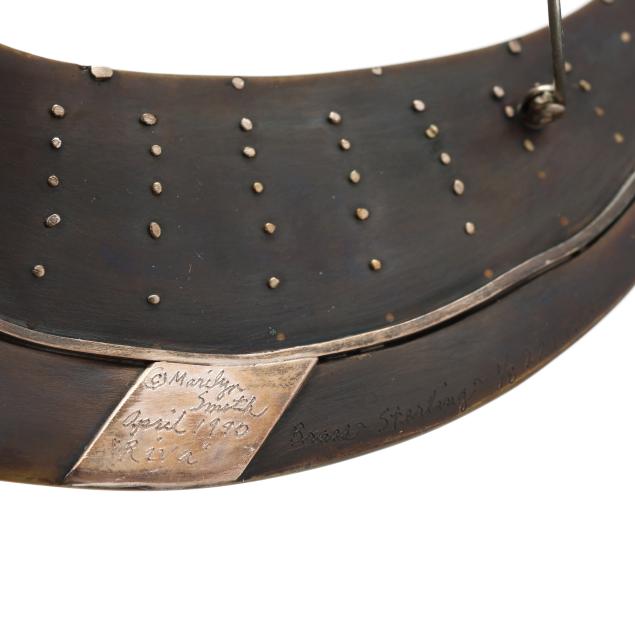Riva, a three dimensional representation of a boat in brass and sterling silver with gold-filled interior, completed with locking pin stem, signed and dated (2 x 4.5 in.).