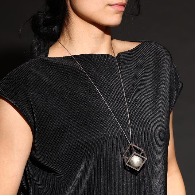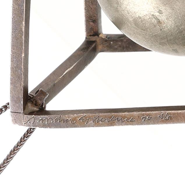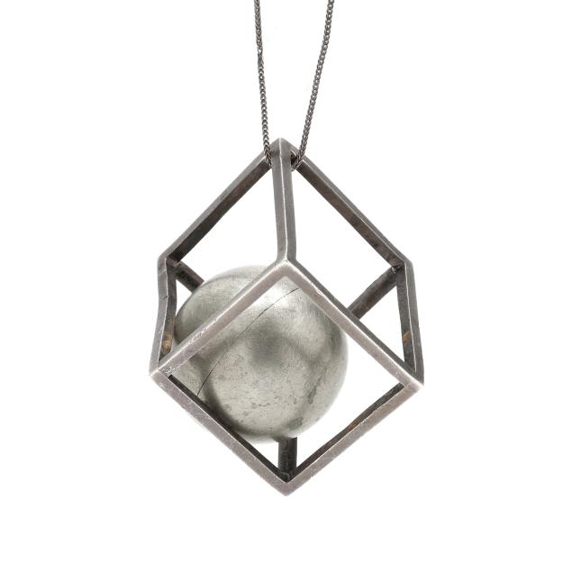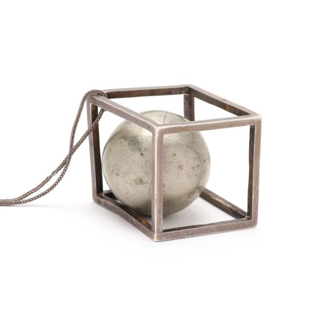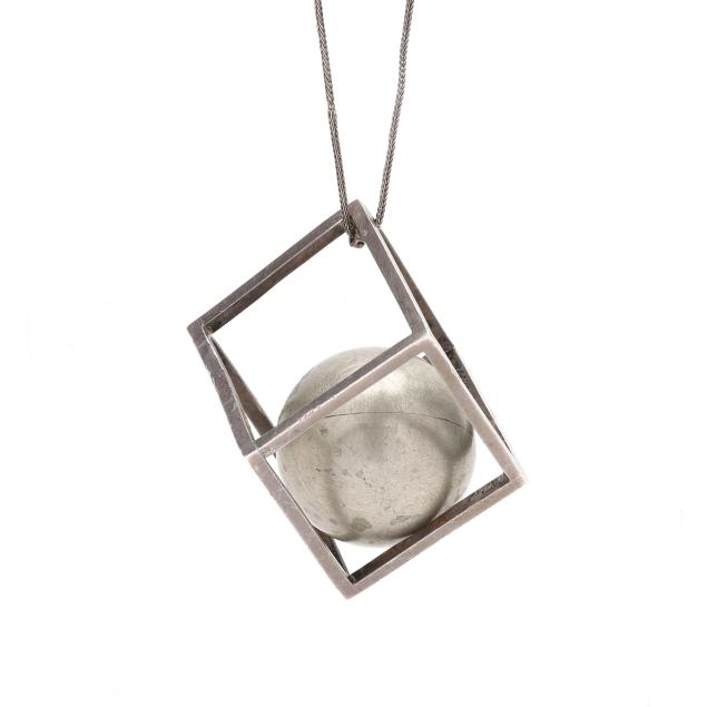 Circa 1990, the cube and ball pendant suspended from a foxtail chain, signed, testing silver.