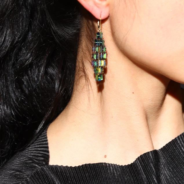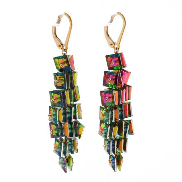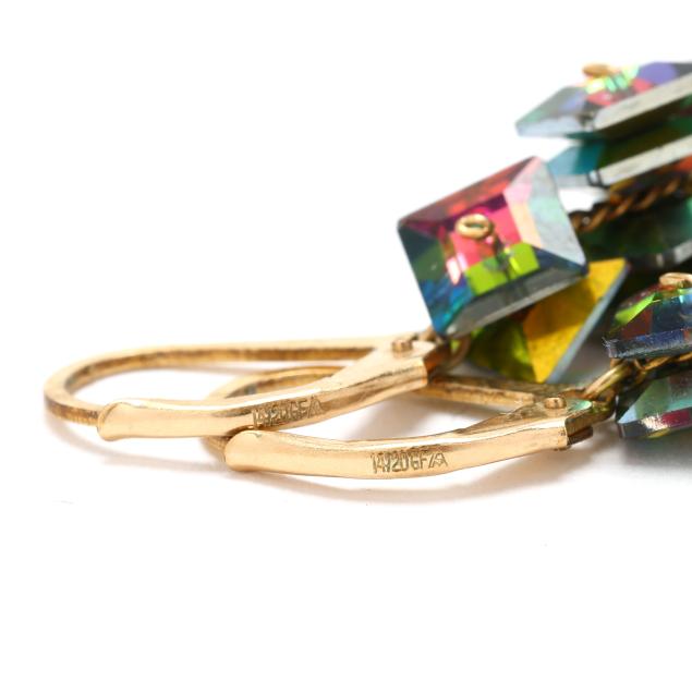 The drop earrings with iridescent crystal beads, completed with lever backs, stamped 14/20 GF, appear unsigned.