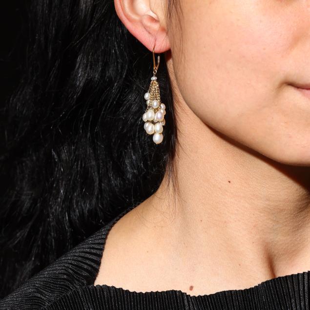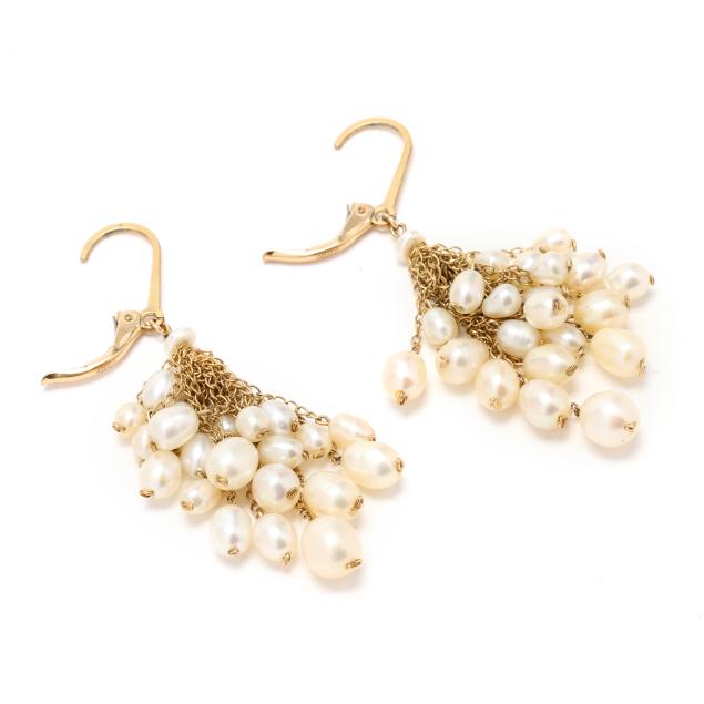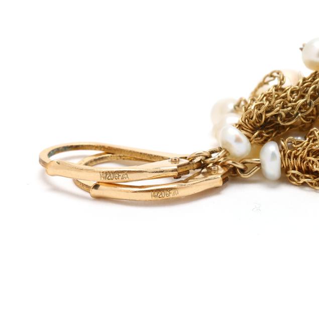 The dangle earrings suspending multiple chains, each set with a seed pearl, completed with a lever back, stamped 14/20 GF, appear unsigned.