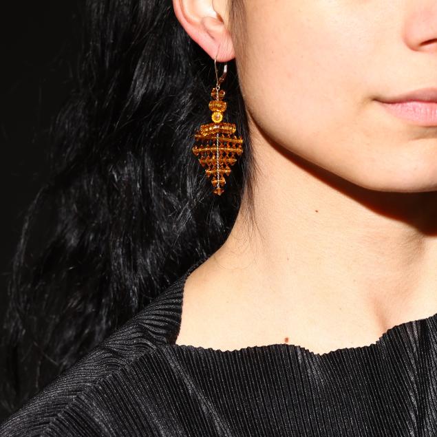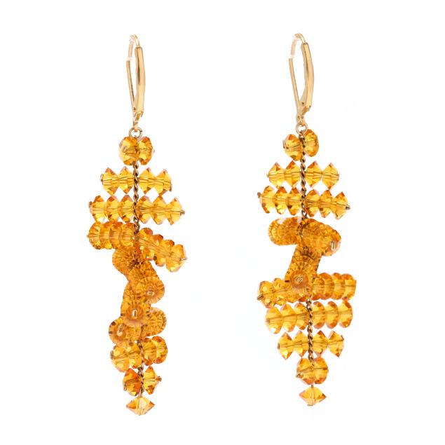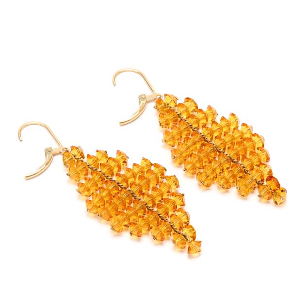 Orange faceted crystal beads in tapering design, completed with gold-filled hinged ear wires, stamped 1/20 GF, appear unsigned.