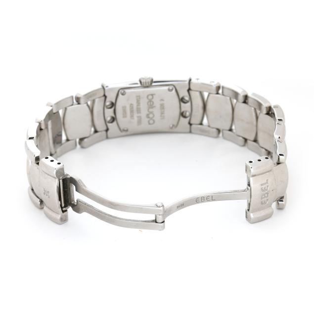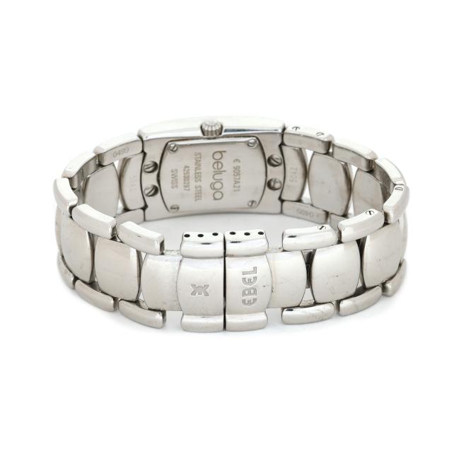 Quartz, Ebel 057, reference number 9057A21, serial number 42530297, the rectangular stainless steel case with polished bezel, the signed mother-of-pearl dial with single cut round diamond melee hour markers and silver-tone baton hands, the stainless steel bracelet numbered 50A2 / 0499, completed with a signed deployant clasp, the caseback numbered and marked Stainless Steel.