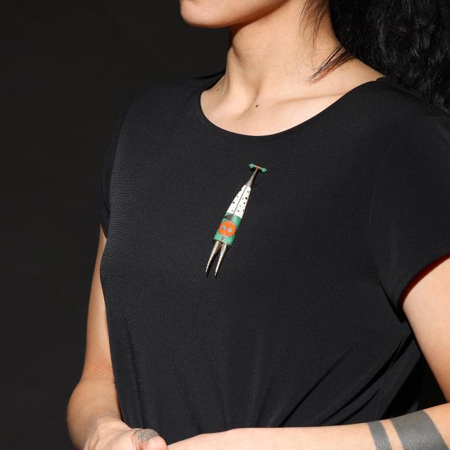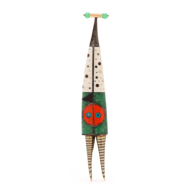 The silver brooch with gold accents, gem-set and with wood, enamel, and various inlays, completed with a locking pin stem, signed, numbered 3494, and stamped 14K / Sterling.