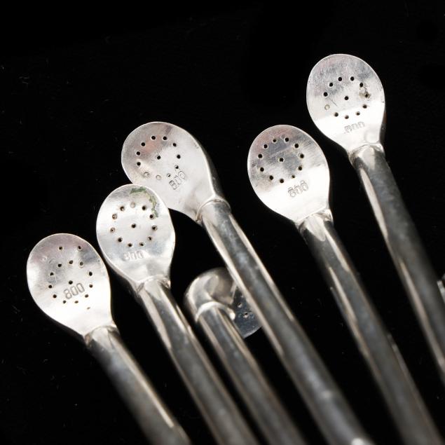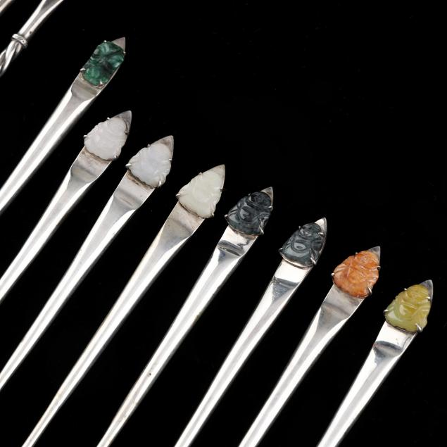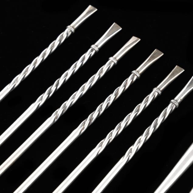 Includes a set of (8) Chinese export sterling silver stirring rods, mark of Wai Kee, late 20th century, with hardstone mounted handles; and a set of (6) Continental .800 silver stirring straws with twisted shafts; none monogrammed.