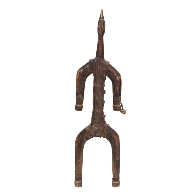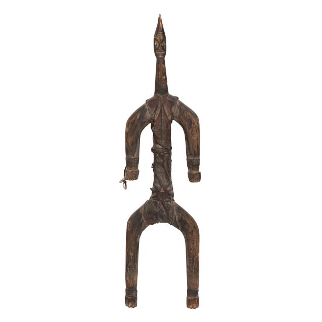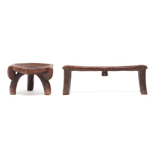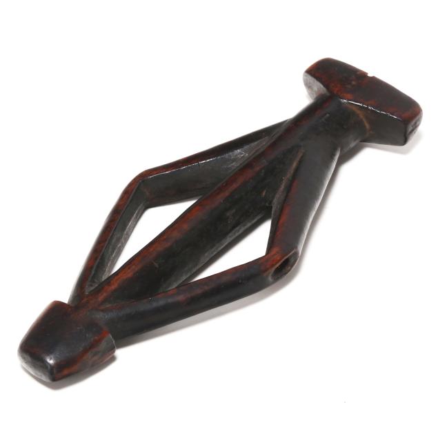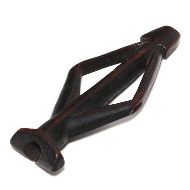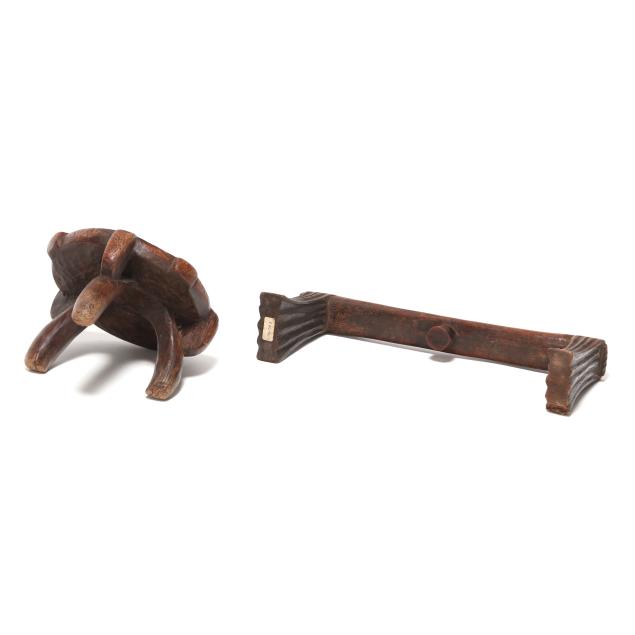 20th century, including a Bwa (Burkina Faso) carved wood whistle (7 1/8 x 2 3/4 x 1 in.); a Swazi (South Africa) carved wood headrest with lug pendant to underside of crossbar and two fluted feet on each end (6 x 17 1/2 x 3 3/8 in.); a figural carved wood and animal hide slingshot, likely Central or West African, with two yellow bead eyes and a cowrie shell pendant (30 x 8 x 2 3/4 in.); and a carved wood