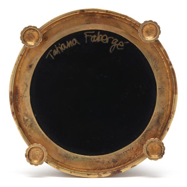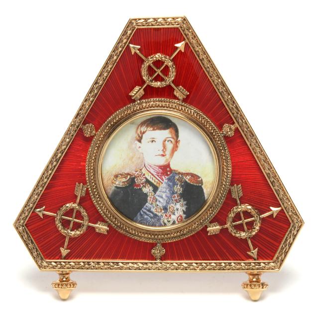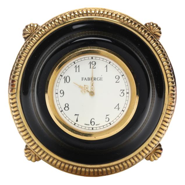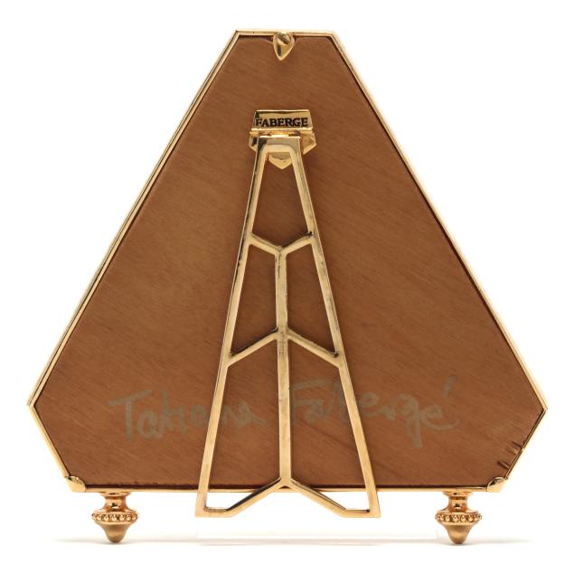 (2) pieces to include a faceted triangular picture frame with red enamel inset and gold finished metal trim on two feet with kickstand (4 3/4 x 5 3/8 in.); and a desk clock with gold plated sterling silver mount, removable dial with arabic numerals and a Swiss movement, atop four feet (3 3/4 in. diameter), both hand signed, clock mount marked "FABERGE" and "925".