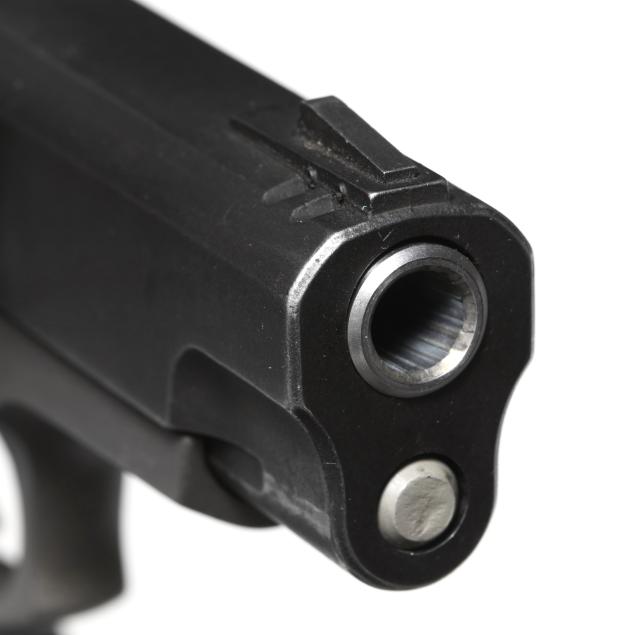 Serial number 301-17508 present on right side of frame, 4 1/2 in. barrel, aluminum frame, blued steel slide, ambidextrous manual safety with decocker, pinned front sight blade with dovetail fixed rear sight, rubber grip scales, lanyard loop, one factory magazine, one aftermarket magazine, factory black plastic case.