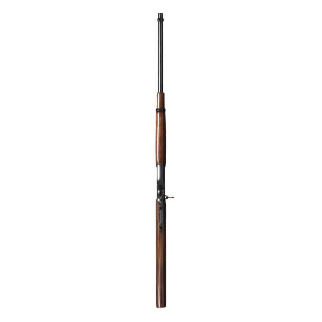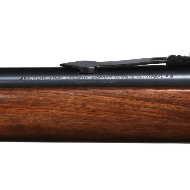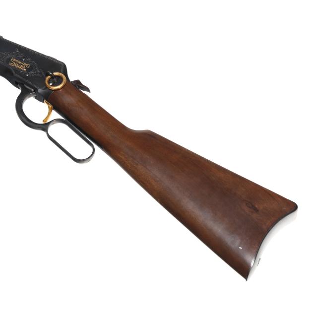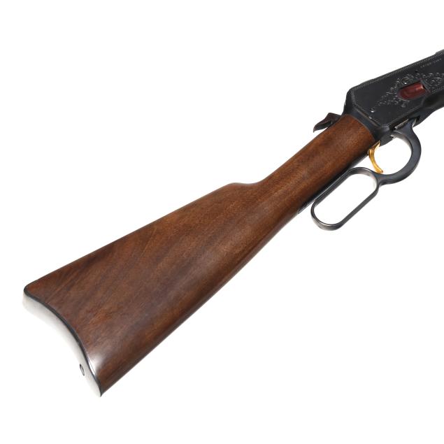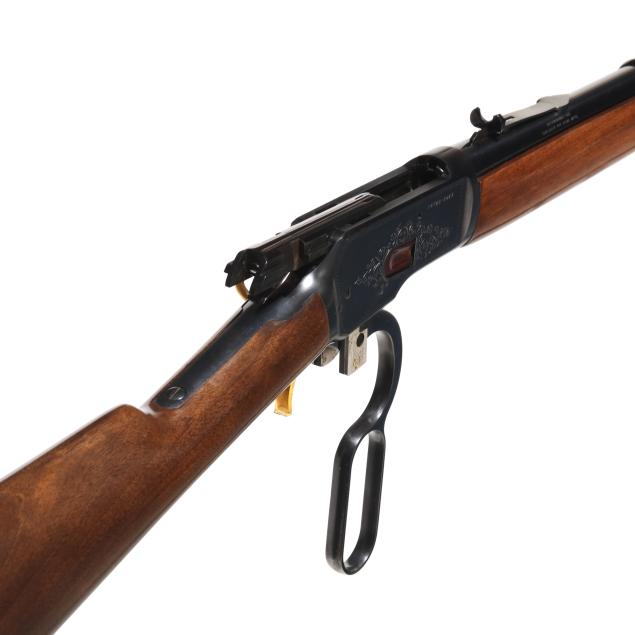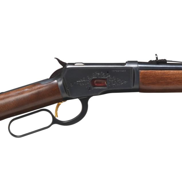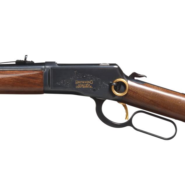 Serial number 1878B-3493 present on right side of blued and engraved lever-action receiver, gold washed text of BROWNING CENTENNIAL 1878-1978 on right side of receiver, text of BROWNING 92 CALIBER 44 REM. MAG. present on blued 20 in. barrel with dovetail rear sight with elevator and dovetail front sight, gold washed saddle ring and trigger, smooth walnut buttstock with factory curved steel buttplate, smooth walnut forend.