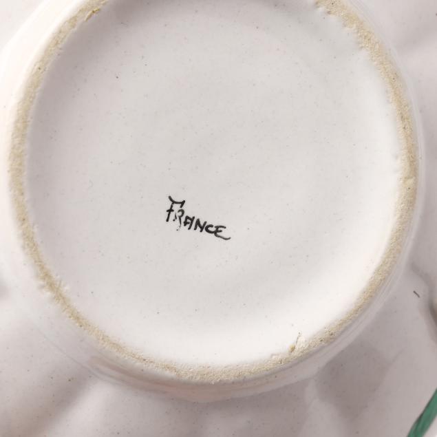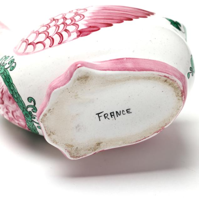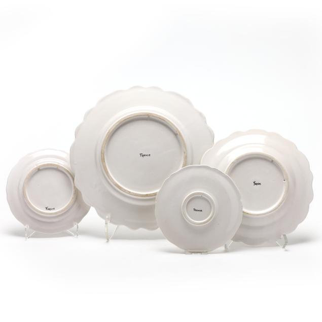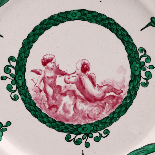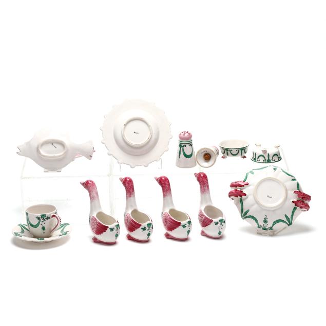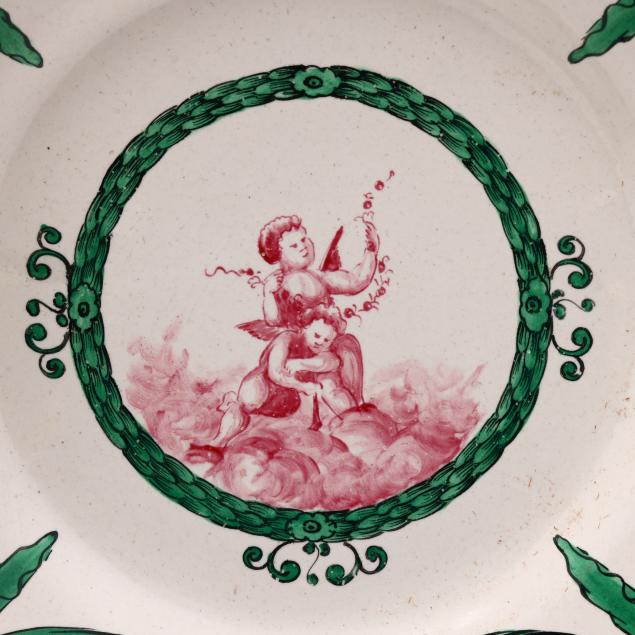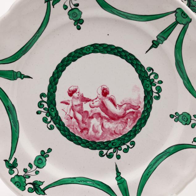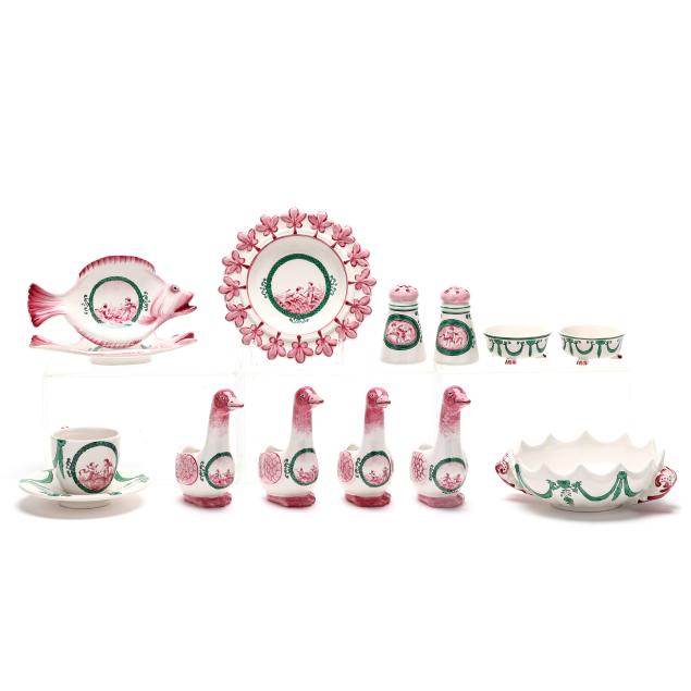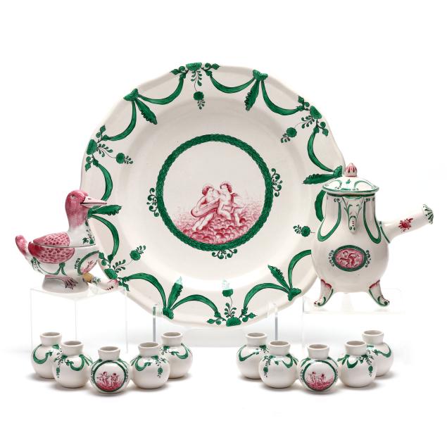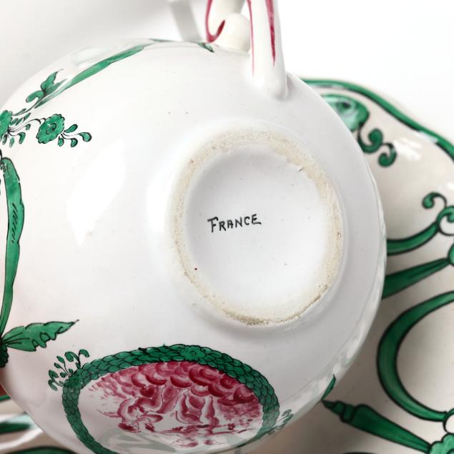 Mid-20th century, (100) pieces featuring white ground with green garlands surrounding central pink vignette of cherubs to include (12) dinner plates (10 1/2 in.); (11) salad plates (8 1/4 in.); (12) bread and butter plates (6 1/8 in.); (7) demitasse cups (2 1/2 in.) and (8) saucers (5 1/8 in.); (11) teacups (2 in.) and (9) saucers (6 in.); (4) individual saucers (6 in.); (8) small dual handled bowls (7 in.); (1) small deep plate with bas-relief leaf decorated flat rim (6 1/2 in.); a surtout de table in the form of (2) curved bands of four joined bud vases (10 x 6 in.); (2) small fish form dishes (6 3/4 in.); (4) small goose form bowls (5 x 5 in.); (1) small goose form covered butter (6 1/4 x 6 in.) with (1) knife (4 7/8 in.); (1) footed teapot (8 3/4 in.); (1) dual handled cover sugar (4 in.); (2) miniature footed bowls (2 3/4 in.); a set of salt and pepper shakers (3 1/4 in.); and a large footed charger (16 5/8 in.), all marked "France" to underside.