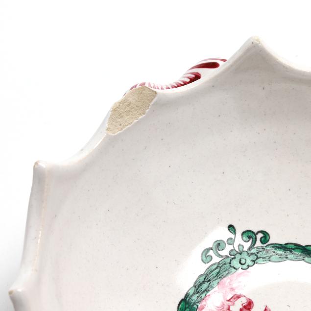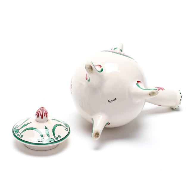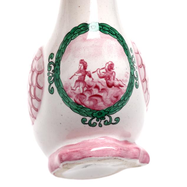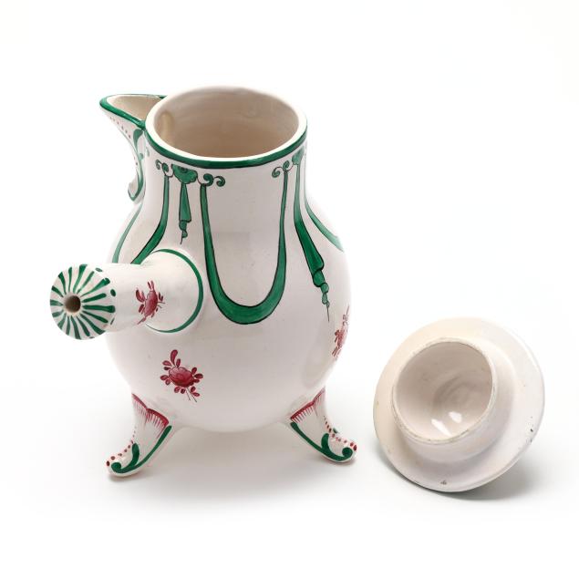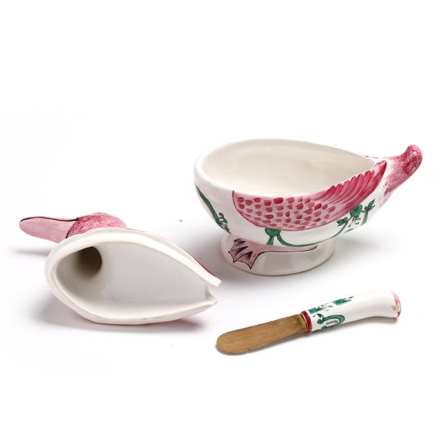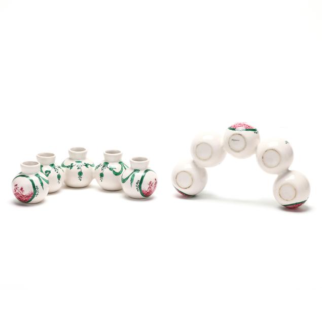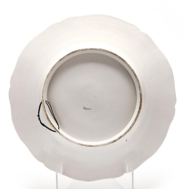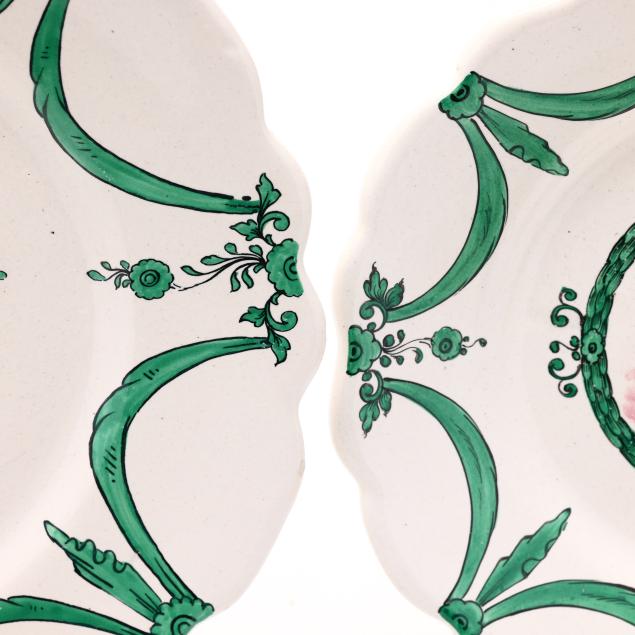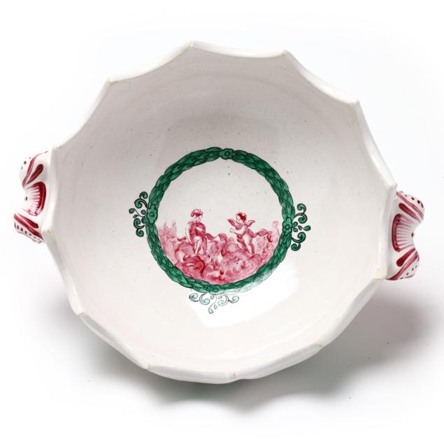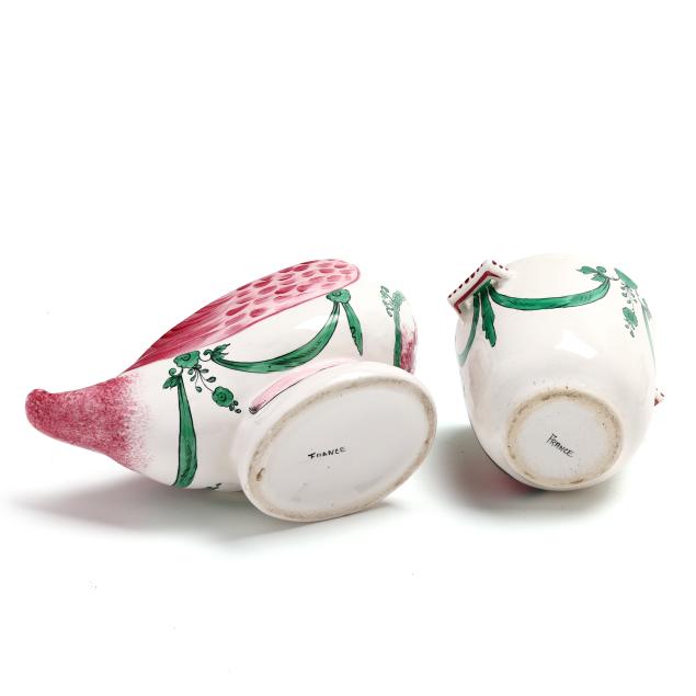 Mid-20th century, (100) pieces featuring white ground with green garlands surrounding central pink vignette of cherubs to include (12) dinner plates (10 1/2 in.); (11) salad plates (8 1/4 in.); (12) bread and butter plates (6 1/8 in.); (7) demitasse cups (2 1/2 in.) and (8) saucers (5 1/8 in.); (11) teacups (2 in.) and (9) saucers (6 in.); (4) individual saucers (6 in.); (8) small dual handled bowls (7 in.); (1) small deep plate with bas-relief leaf decorated flat rim (6 1/2 in.); a surtout de table in the form of (2) curved bands of four joined bud vases (10 x 6 in.); (2) small fish form dishes (6 3/4 in.); (4) small goose form bowls (5 x 5 in.); (1) small goose form covered butter (6 1/4 x 6 in.) with (1) knife (4 7/8 in.); (1) footed teapot (8 3/4 in.); (1) dual handled cover sugar (4 in.); (2) miniature footed bowls (2 3/4 in.); a set of salt and pepper shakers (3 1/4 in.); and a large footed charger (16 5/8 in.), all marked "France" to underside.