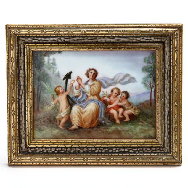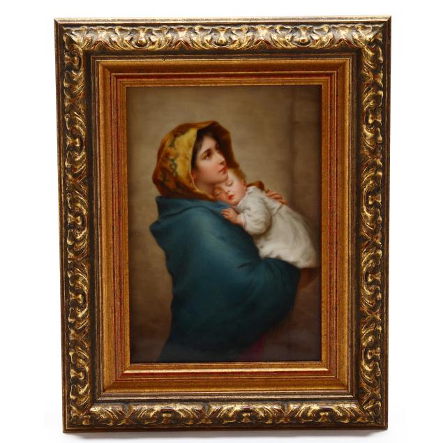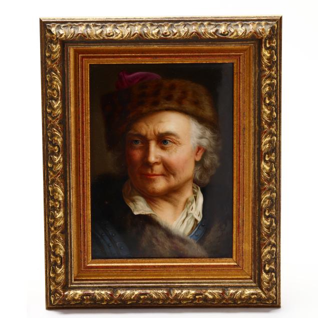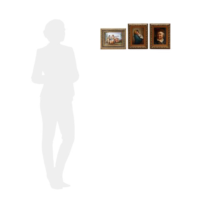 Madonnina after Roberto Ferruzzi (Italian, 1853-1934); a portrait of an elderly gentleman in a fur cap, also likely by KPM, signed to lower right; and a Baroque style painting of a woman and putti in a bucolic setting, signed to lower right.