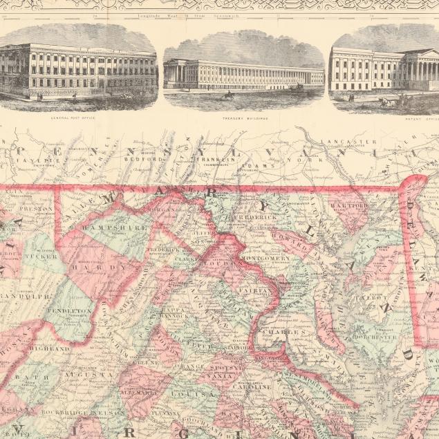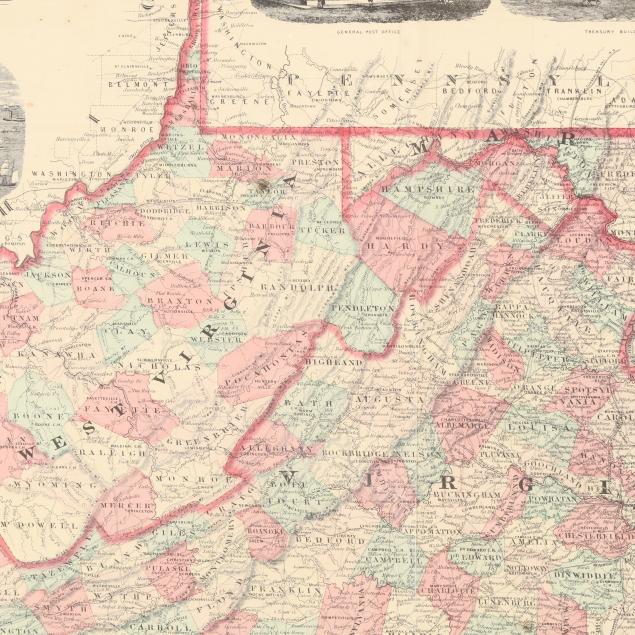 A[lvin] J[ewett] Johnson. JOHNSON'S VIRGINIA, DELAWARE, MARYLAND & WEST VIRGINIA. New York: A. J. Johnson, mid to late 1860s. With hand-coloring by county, and views of Fortress Monroe, the General Post Office, Treasury Buildings, the Patent Office, and University of Virginia. Displayed behind a mat and framed.