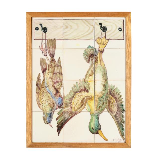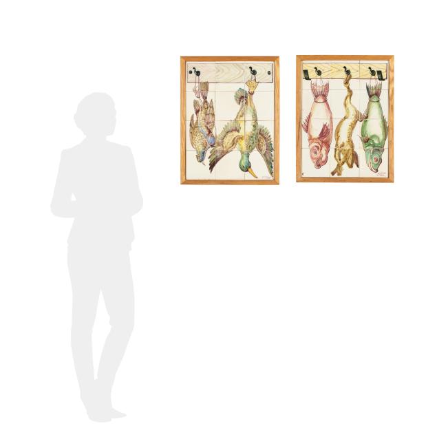 Portugal, late 20th to early 21st century, painted ceramic tiles assembled to form scenes of hanging game animals, both signed to lower right and displayed in wood frames.