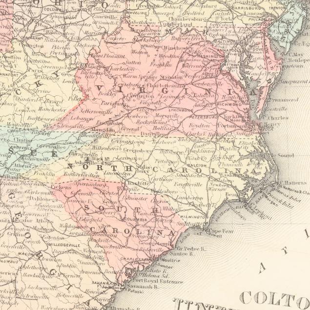 The History, Civil, Political and Military of the Southern Rebellion. New York: James D. Torrey, 1862. Hand-coloring and outlines; presenting the United States as far west as Colorado and down to Texas and Florida, with "Indian Territory," "Dakota," no West Virginia (it became a state in 1863), and flags indicating military forts; displayed under a mat and nicely framed.